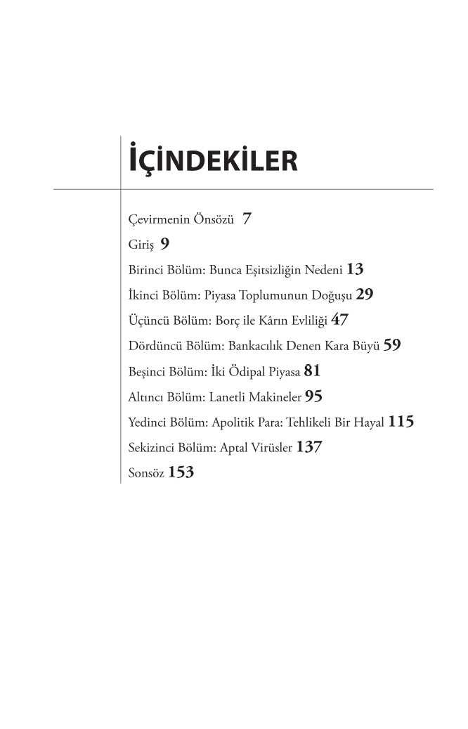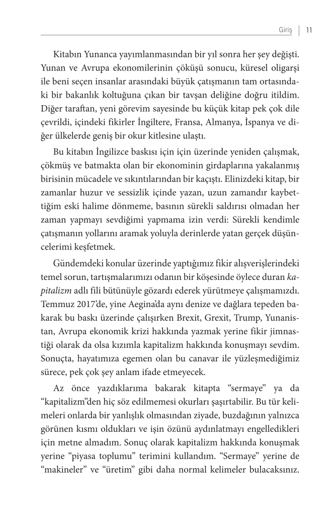 •Borç, para ve servetin kökeni nedir? •Toplumlar arası eşitsizlikler nasıl ortaya çıktı ve derinleşti? •Piyasaları olan toplumlar neden ve nasıl piyasa toplumlarına dönüştü? •Takas değerinin deneyimsel değere üstünlüğü hangi sonuçları doğurdu? •Yoktan para yaratılması nasıl mümkün olabilir? •Borç ile kâr neden birbirinden ayrılamaz? •Neden kamu borcu diğer borç tiplerinden farklıdır? •Emek ve para piyasalarını diğer piyasalardan ayıran nedir? •İnsan emeği üretim sürecinden bütünüyle çıkarılabilir mi? •Bankacılar neden krizleri tetikleyici şekilde davranırlar? •Enflasyon, deflasyon ve arbitraj nasıl işler? •Para politikalarını siyasetten ayırmak mümkün müdür? •Piyasa ekonomilerinin sorunları daha çok piyasa ile çözülebilir mi? •Ekonomi, mutluluk ve anlam arayışı üzerine bize neler söyleyebilir? Yunanistan ekonomi bakanlığı döneminde uluslararası üne kavuşan saygın muhalif ekonomist Yanis Varoufakis, bu küçük ancak yoğun kitapta günümüz ekonomisinin yapısını ve bu yapının insanlık için doğurduğu sorunları somut örneklerle, terminolojinin tutsağı olmadan başarıyla özetliyor. Yayımlandığı 24 ülkede ilgiyle karşılanan Kızımla Ekonomi Sohbetleri yazarın kızıyla sohbet havasında kaleme aldığı, akademik derinliğe dayanmakla birlikte son derece ulaşılabilir ve akıcı bir metin. Hem gençler hem de günümüz ekonomisini anlamak isteyen ve alanda teknik bilgisi olmayan okurlar için oldukça değerli bir giriş kaynağı. Varoufakis ekonominin "uzmanlara bırakılması gereken" bir bilim değil, siyasi ve sosyal güçlerin etkisinde, tüm insanlığın bugününü ve geleceğini etkileme gücüne sahip bir savaş alanı olduğunu söylüyor ve hepimizi bu gerçekliği anlamaya davet ediyor. "Varoufakis en büyük siyasi erdemler olan cesaret ve dürüstlüğün ikisinden de nasibini almış." - THE TIMES "Az sayıdaki kahramanımdan biri, Varoufakis gibi insanlar oldukça hâlâ umut var." - SLAVOJ ŽIŽEK "Uzmanlar çoğu zaman karmaşık fikirleri basit şekilde açıklamaktansa jargonun arkasına saklanmayı yeğler. Varoufakis ise bu alışkanlığı paramparça ediyor, ilk argümanlarından biri eğer ekonomiyi uzmanlara bırakırsak en önemli siyasi kararları da onlara bırakacağımız. Bu kitap sayesinde Varoufakis okurlarını yeni bir dille donatırken pek çok ekonomi balonunu da arka arkaya patlatıyor." - THE GUARDIAN "Varoufakis'in kapitalizm tarihi yazarın her zamanki akıcı üslubunu ve öğretme heyecanını yansıtıyor. Bankacıların kara büyüsünü anlamaya çalışanların arayışları artık sona erebilir." - FINANCIAL TIMES