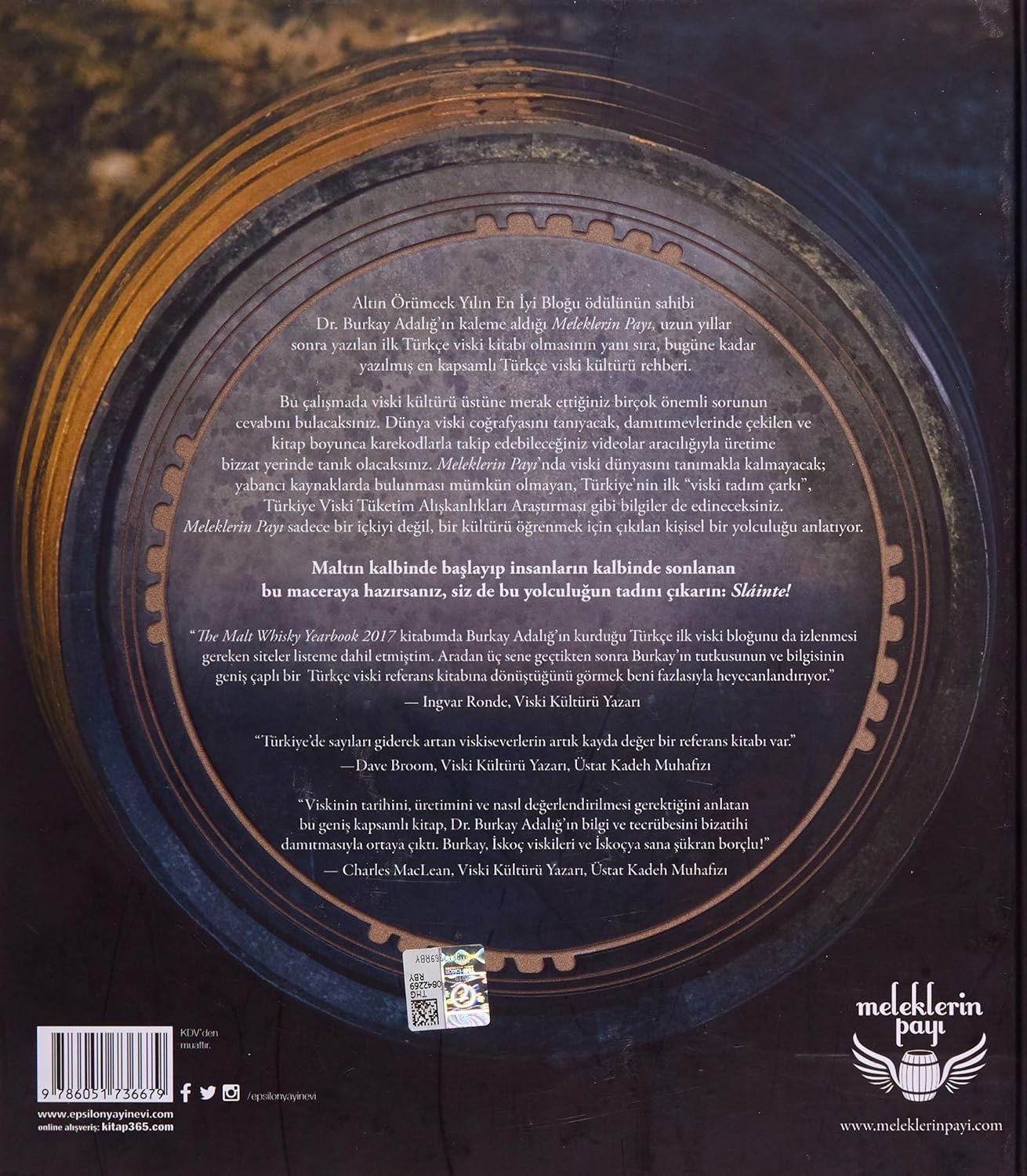 Altın Örümcek Yılın En İyi Bloğu ödülünün sahibi Dr. Burkay Adalığ'ın kaleme aldığı Meleklerin Payı, uzun yıllar sonra yazılan ilk Türkçe viski kitabı olmasının yanı sıra, bugüne kadar yazılmış en kapsamlı Türkçe viski kültürü rehberi. Viski tam olarak nedir, nasıl ortaya çıktı? Hangi ülkeler hangi viskileri üretiyor? Viski üretim sürecinin püf noktaları neler? Kaç viski türü var, aralarındaki fark ne? Viski nasıl satın alınır, viski etiketleri nasıl okunur? Viski nasıl tüketilmeli? Viskinin yanına neler yakışır? Viski tadımı nasıl yapılır? Viski hakkında doğru bilinen yanlışlar neler? İlk ve Türk viskisi olan Ankara Viskisi nasıl ortaya çıktı? Popüler kültür ve viski arasında nasıl bir etkileşim var? "Türkiye'de sayıları giderek artan viskiseverlerin artık kayda değer bir referans kitabı var." —Dave Broom, Viski Kültürü Yazarı, Üstat Kadeh Muhafızı Bu çalışmada dünya viski coğrafyasını tanıyacak, damıtımevlerinde çekilen ve kitap boyunca karekodlarla takip edebileceğiniz videolar aracılığıyla üretime bizzat yerinde tanık olacaksınız. Meleklerin Payı'nda viski dünyasını tanımakla kalmayacak; yabancı kaynaklarda bulunması mümkün olmayan, Türkiye'nin ilk "viski tadım çarkı", Türkiye Viski Tüketim Alışkanlıkları Araştırması gibi bilgiler de edineceksiniz. Meleklerin Payı sadece bir içkiyi değil, bir kültürü öğrenmek için çıkılan kişisel bir yolculuğu anlatıyor. "The Malt Whisky Yearbook 2017 kitabımda Burkay Adalığ'ın kurduğu Türkçe ilk viski bloğunu da izlenmesi gereken siteler listeme dahil etmiştim. Aradan üç sene geçtikten sonra Burkay'ın tutkusunun ve bilgisinin geniş çaplı bir Türkçe viski referans kitabına dönüştüğünü görmek beni fazlasıyla heyecanlandırıyor." — Ingvar Ronde, Viski Kültürü Yazarı "Viskinin tarihini, üretimini ve nasıl değerlendirilmesi gerektiğini anlatan bu geniş kapsamlı kitap, Dr. Burkay Adalığ'ın bilgi ve tecrübesini bizatihi damıtmasıyla ortaya çıktı. Burkay, İskoç viskileri ve İskoçya sana şükran borçlu!" — Charles MacLean, Viski Kültürü Yazarı, Üstat Kadeh Muhafızı
