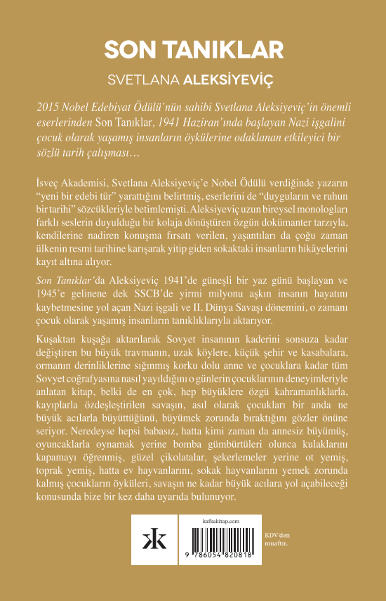 2015 Nobel Edebiyat Ödülü'nün sahibi Svetlana Aleksiyeviç'in önemli eserlerinden Son Tanıklar, 1941 Haziran'ında başlayan Nazi işgalini çocuk olarak yaşamış insanların öykülerine odaklanan etkileyici bir sözlü tarih çalışması... İsveç Akademisi, Svetlana Aleksiyeviç'e Nobel Ödülü verdiğinde yazarın "yeni bir edebi tür" yarattığını belirtmiş, eserlerini de "duyguların ve ruhun bir tarihi" sözcükleriyle betimlemişti. Aleksiyeviç uzun bireysel monologları farklı seslerin duyulduğu bir kolaja dönüştüren özgün dokümanter tarzıyla, kendilerine nadiren konuşma fırsatı verilen, yaşantıları da çoğu zaman ülkenin resmi tarihine karışarak yitip giden sokaktaki insanların hikâyelerini kayıt altına alıyor. Son Tanıklar'da Aleksiyeviç 1941'de güneşli bir yaz günü başlayan ve 1945'e gelinene dek SSCB'de yirmi milyonu aşkın insanın hayatını kaybetmesine yol açan Nazi işgali ve II. Dünya Savaşı dönemini, o zamanı çocuk olarak yaşamış insanların tanıklıklarıyla aktarıyor. Kuşaktan kuşağa aktarılarak Sovyet insanının kaderini sonsuza kadar değiştiren bu büyük travmanın, uzak köylere, küçük şehir ve kasabalara, ormanın derinliklerine sığınmış korku dolu anne ve çocuklara kadar tüm Sovyet coğrafyasına nasıl yayıldığını o günlerin çocuklarının deneyimleriyle anlatan kitap, belki de en çok, hep büyüklere özgü kahramanlıklarla, kayıplarla özdeşleştirilen savaşın, asıl olarak çocukları bir anda ne büyük acılarla büyüttüğünü, büyümek zorunda bıraktığını gözler önüne seriyor. Neredeyse hepsi babasız, hatta kimi zaman da annesiz büyümüş, oyuncaklarla oynamak yerine bomba gümbürtüleri olunca kulaklarını kapamayı öğrenmiş, güzel çikolatalar, şekerlemeler yerine ot yemiş, toprak yemiş, hatta ev hayvanlarını, sokak hayvanlarını yemek zorunda kalmış çocukların öyküleri, savaşın ne kadar büyük acılara yol açabileceği konusunda bize bir kez daha uyarıda bulunuyor. "Vaktinde Dostoyevski şöyle bir soru atmıştı ortaya: Eğer masum bir çocuğun gözünden tek damla yaş dökülecekse, barışın, mutluluğumuzun ve hatta yeryüzünde ebedi uyumun sağlanması ve temellerinin güçlü bir şekilde atılması için yaşanacakla mazur görülebilir mi? Sorusunu yine kendi yanıtlamıştı Dostoyevski; hiçbir ilerleme, hiçbir devrim o gözyaşının dökülmesini haklı gösteremez. Hiçbir savaş. O gözyaşı damlası her daim her şeyden kıymetlidir. O tek damlacık gözyaşı... "Köyde hiç çocuk kalmamıştı. Sokakta beraber oyun oynayacak kimse yoktu..."