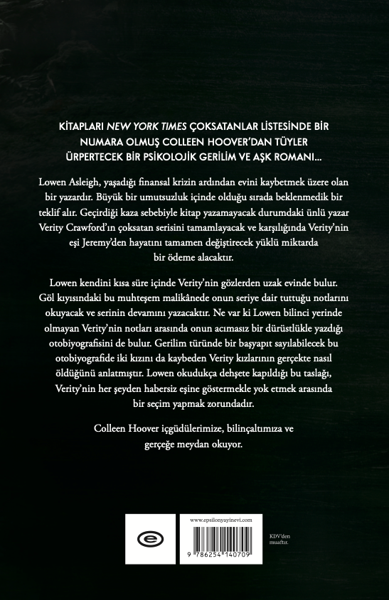 KİTAPLARI NEW YORK TIMES ÇOKSATANLAR LİSTESİNDE BİR NUMARA OLMUŞ COLLEEN HOOVER’DAN TÜYLER ÜRPERTECEK BİR PSİKOLOJİK GERİLİM VE AŞK ROMANI... Lowen Asleigh, yaşadığı finansal krizin ardından evini kaybetmek üzere olan bir yazardır. Büyük bir umutsuzluk içinde olduğu sırada beklenmedik bir teklif alır. Geçirdiği kaza sebebiyle kitap yazamayacak durumdaki ünlü yazar Verity Crawford’ın çoksatan serisini tamamlayacak ve karşılığında Verity’nin eşi Jeremy’den hayatını tamamen değiştirecek yüklü miktarda bir ödeme alacaktır. Lowen kendini kısa süre içinde Verity’nin gözlerden uzak evinde bulur. Göl kıyısındaki bu muhteşem malikânede onun seriye dair tuttuğu notlarını okuyacak ve serinin devamını yazacaktır. Ne var ki Lowen bilinci yerinde olmayan Verity’nin notları arasında onun acımasız bir dürüstlükle yazdığı otobiyografisini de bulur. Gerilim türünde bir başyapıt sayılabilecek bu otobiyografide iki kızını da kaybeden Verity kızlarının gerçekte nasıl öldüğünü anlatmıştır. Lowen okudukça dehşete kapıldığı bu taslağı, Verity’nin her şeyden habersiz eşine göstermekle yok etmek arasında bir seçim yapmak zorundadır. Colleen Hoover içgüdülerimize, bilinçaltımıza ve gerçeğe meydan okuyor. “Otobiyografilerle ilgili en tiksindiğim şey, her cümleden sahte düşüncelerin akmasıdır. Bir yazar, ruhu ve kitabı arasındaki her koruma katmanını ayırmaya istekli olmadıkça asla kendisi hakkında yazma cüretini göstermemelidir. Kelimeler doğrudan yürekten gelmeli, özgür kalırken etle kemiği parçalamalıdır. Çirkin, dürüst, kanlı ve biraz dehşet verici ama tamamen ortada. Okuru yazardan hoşlanması için teşvik eden bir otobiyografi, gerçek bir otobiyografi değildir. Kimse içten dışa sevilesi değildir. Birisi bir otobiyografiyi bitirdiğinde, en iyi ihtimalle, yazara karşı rahatsız edici bir tiksinti duyuyor olmalıdır. Ben bunu yapacağım. Okuyacağınız şey zaman zaman o kadar kötü bir tat bırakacak ki tükürmek isteyecek ama bu kelimeleri yutacaksınız, okuduklarınız bir parçanız hâline gelecek, içinize işleyecek ve onlar yüzünden acı çekeceksiniz. Ancak... benim sert uyarımla beraber... kelimelerimi yutmaya devam edeceksiniz çünkü buradasınız. İnsan. Meraklı. Devam edin.” -Verity Crawford