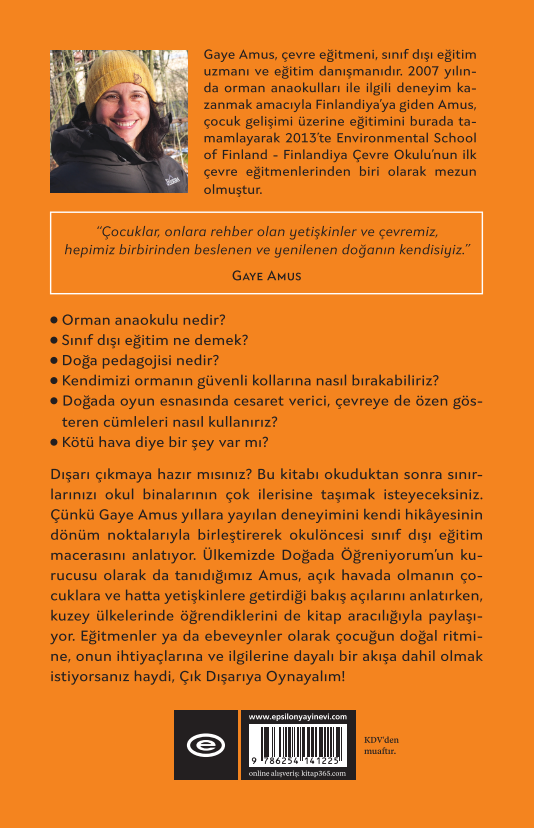 Bu kitabı okuduktan sonra sınırlarınızı okul binalarının çok ilerisine taşımak isteyeceksiniz. Çünkü Gaye Amus yıllara yayılan deneyimini kendi hikâyesinin dönüm noktalarıyla birleştirerek okulöncesi sınıf dışı eğitim macerasını anlatıyor. Ülkemizde Doğada Öğreniyorum’un kurucusu olarak da tanıdığımız Amus, açık havada olmanın çocuklara ve hatta yetişkinlere getirdiği bakış açılarını anlatırken, kuzey ülkelerinde öğrendiklerini de kitap aracılığıyla paylaşıyor. Eğitmenler ya da ebeveynler olarak çocuğun doğal ritmine, onun ihtiyaçlarına ve ilgilerine dayalı bir akışa dahil olmak istiyorsanız haydi,