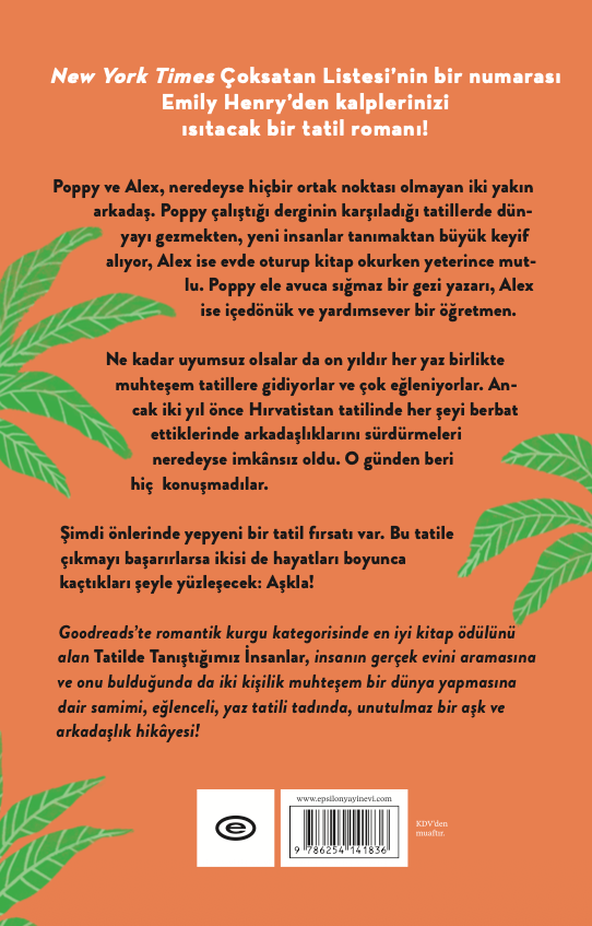 New York Times Çoksatan Listesi’nin bir numarası Emily Henry’den kalplerinizi ısıtacak bir tatil romanı! Poppy ve Alex, neredeyse hiçbir ortak noktası olmayan iki yakın arkadaş. Poppy çalıştığı derginin karşıladığı tatillerde dünyayı gezmekten, yeni insanlar tanımaktan büyük keyif alıyor, Alex ise evde oturup kitap okurken yeterince mutlu. Poppy ele avuca sığmaz bir gezi yazarı, Alex ise içedönük ve yardımsever bir öğretmen. Ne kadar uyumsuz olsalar da on yıldır her yaz birlikte muhteşem tatillere gidiyorlar ve çok eğleniyorlar. Ancak iki yıl önce Hırvatistan tatilinde her şeyi berbat ettiklerinde arkadaşlıklarını sürdürmeleri neredeyse imkânsız oldu. O günden beri hiç konuşmadılar. Şimdi önlerinde yepyeni bir tatil fırsatı var. Bu tatile çıkmayı başarırlarsa ikisi de hayatları boyunca kaçtıkları şeyle yüzleşecek: Aşkla! Goodreads’te romantik kurgu kategorisinde en iyi kitap ödülünü alan Tatilde Tanıştığımız İnsanlar, insanın gerçek evini aramasına ve onu bulduğunda da iki kişilik muhteşem bir dünya yapmasına dair samimi, eğlenceli, yaz tatili tadında, unutulmaz bir aşk ve arkadaşlık hikâyesi!