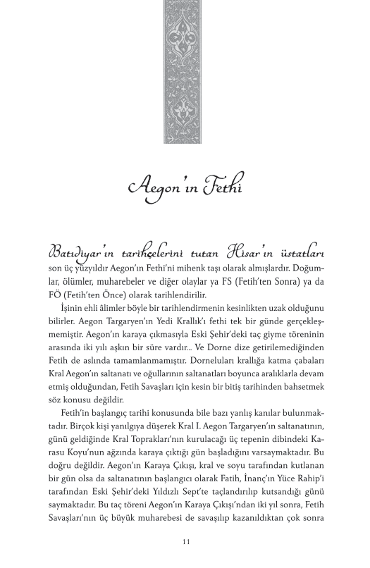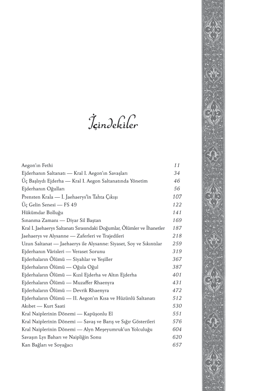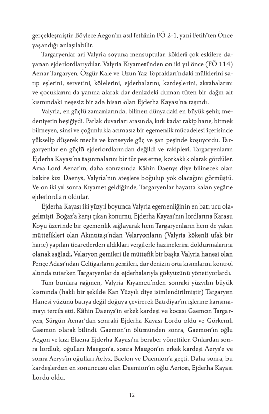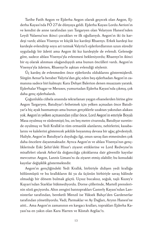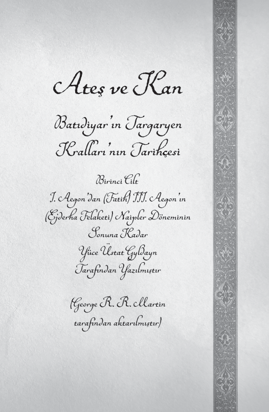 Taht Oyunları’nda yaşanan olaylardan yüzyıllar önce, –Valyria Kıyameti’nden sağ çıkan tek ejderlordları ailesi olan– Targaryen Hanesi, Ejderha Kayası’na yerleşmişti. Batıdiyar tarihinin en şanlı ama bir o kadar da tartışmalı hanesinin öyküsü, Ateş ve Kan’da, ateş ve kanla yazılıyor. Ejderhanın ejderhayla, kardeşin kardeşle savaştığı, bildiğimiz anlamda Batıdiyar'ı Batıdiyar yapan bu dönem, Demir Taht’ın yaratıcısı efsanevi Fatih Aegon’la başlıyor. Fatih’ten sonra gelen âlimler ve zalimler, korkaklar ve kahramanlar ama en çok da muazzam ejderhalar o tahtı elinde tutmak isteyen kral ve kraliçelerin hırslarının bir parçası oluyor. Peki Ejderhaların Dansı boyunca aslında neler yaşandı? Yedi Krallık nasıl kuruldu? Kıyamet’ten sonra Valyria’yı ziyaret etmek neden o kadar tehlikeliydi? Daenerys’in üç ejderha yumurtasının kökeni neydi? Hisar’ın bilge üstadı tarafından nakledilen ve ressam Doug Wheatley’nin elinden çıkma yepyeni siyah-beyaz illüstrasyonlarla süslenmiş bu çok önemli tarihçede cevabını bulan soruların birkaçı işte bunlar. Takvimler geriye dönüyor, haneler yükselip yıkılıyor ve taht oyunlarının hem en kolay hem de en zor olduğu dönemde Targaryen tarihinin bütün detayları ilk kez gözlerimizin önüne seriliyor. Tanrılar, Targaryenlar için bir kez daha yazı tura atıyor… Ya kan ya da ateş.