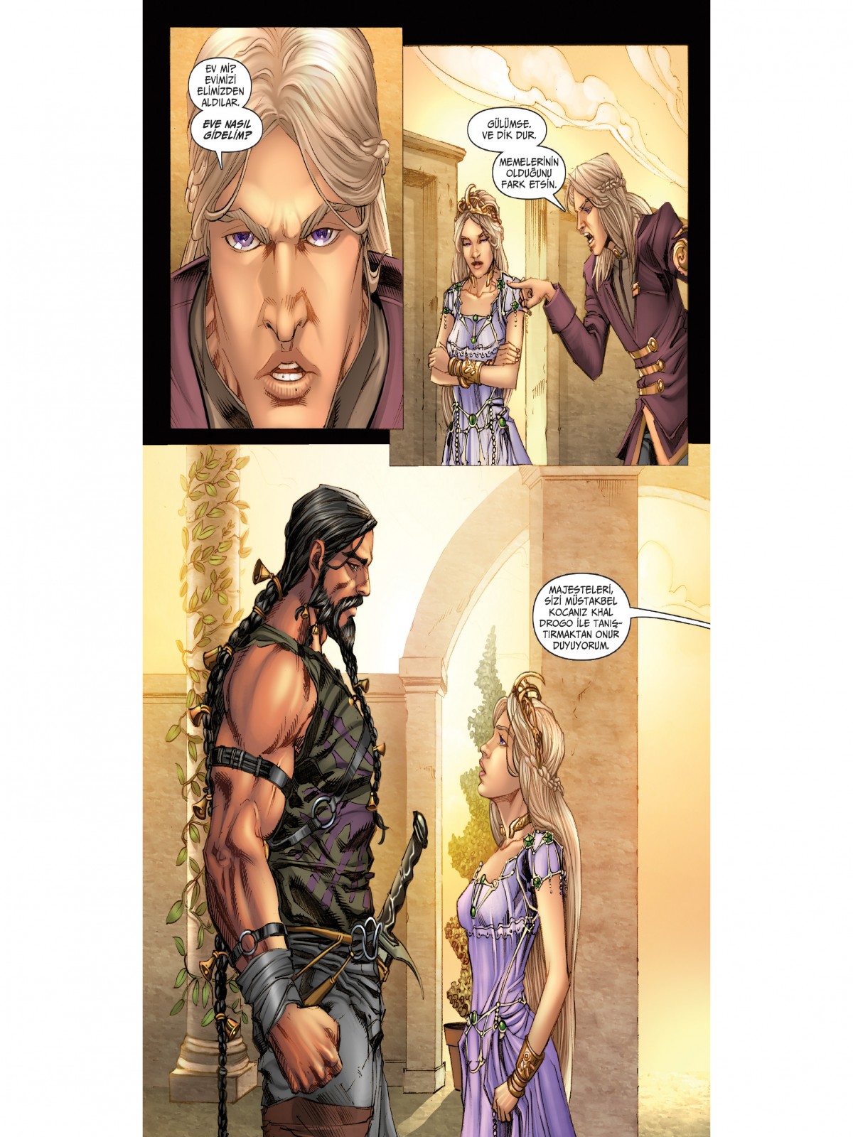 Dar Deniz’in fersah fersah ötesinde ise vaktiyle tüm Batıdiyar’a hükmeden Targaryen Hanesi’nin varisi Prens Viserys, yeniden tahta geçme arzusuyla masumiyet timsali güzeller güzeli kız kardeşi Daenarys’i, barbar Dothraklardan Khal Drogo’yla evlendirmekten çekinmiyor.