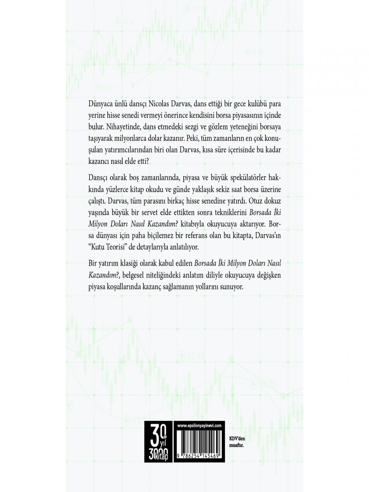 Dünyaca ünlü dansçı Nicolas Darvas, dans ettiği bir gece kulübü para yerine hisse senedi vermeyi önerince kendisini borsa piyasasının içinde bulur. Nihayetinde, dans etmedeki sezgi ve gözlem yeteneğini borsaya taşıyarak milyonlarca dolar kazanır. Peki, tüm zamanların en çok konuşulan yatırımcılarından biri olan Darvas, kısa süre içerisinde bu kadar kazancı nasıl elde etti? Dansçı olarak boş zamanlarında, piyasa ve büyük spekülatörler hakkında yüzlerce kitap okudu ve günde yaklaşık sekiz saat borsa üzerine çalıştı. Darvas, tüm parasını birkaç hisse senedine yatırdı. Otuz dokuz yaşında büyük bir servet elde ettikten sonra tekniklerini Borsada İki Milyon Doları Nasıl Kazandım? Kitabıyla okuyucuya aktarıyor. Borsa dünyası için paha biçilemez bir referans olan bu kitapta, Darvas’ın “Kutu Teorisi” de detaylarıyla anlatılıyor. Bir yatırım klasiği olarak kabul edilen Borsada İki Milyon Doları Nasıl Kazandım?, belgesel niteliğindeki anlatım diliyle okuyucuya değişken piyasa koşullarında kazanç sağlamanın yollarını sunuyor.