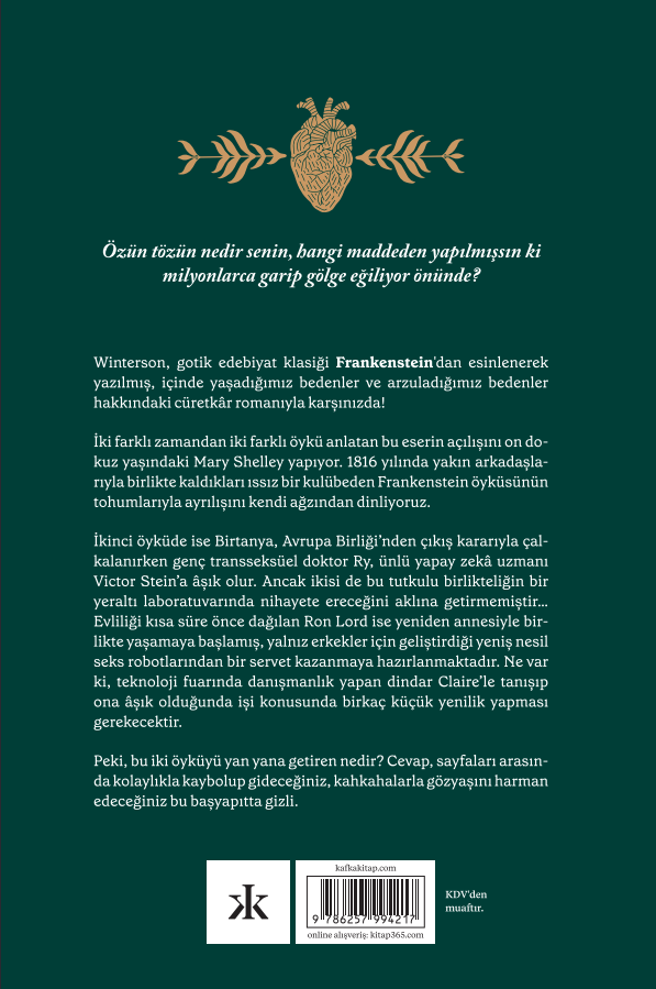 Özün tözün nedir senin, hangi maddeden yapılmışsın ki milyonlarca garip gölge eğiliyor önünde? Winterson, gotik edebiyat klasiği Frankenstein`dan esinlenerek yazılmış, içinde yaşadığımız bedenler ve arzuladığımız bedenler hakkındaki cüretkâr romanıyla karşınızda! İki farklı zamandan iki farklı öykü anlatan bu eserin açılışını on dokuz yaşındaki Mary Shelley yapıyor. 1816 yılında yakın arkadaşlarıyla birlikte kaldıkları ıssız bir kulübeden Frankenstein öyküsünün tohumlarıyla ayrılışını kendi ağzından dinliyoruz. İkinci öyküde ise Britanya, Avrupa Birliği’nden çıkış kararıyla çalkalanırken genç transseksüel doktor Ry, ünlü yapay zekâ uzmanı Victor Stein’a âşık olur. Ancak ikisi de bu tutkulu birlikteliğin bir yeraltı laboratuvarında nihayete ereceğini aklına getirmemiştir... Evliliği kısa süre önce dağılan Ron Lord ise yeniden annesiyle birlikte yaşamaya başlamış, yalnız erkekler için geliştirdiği yeni nesil seks robotlarından bir servet kazanmaya hazırlanmaktadır. Ne var ki, teknoloji fuarında danışmanlık yapan dindar Claire’le tanışıp ona âşık olduğunda işi konusunda birkaç küçük yenilik yapması gerekecektir. Peki, bu iki öyküyü yan yana getiren nedir? Cevap, sayfaları arasında kolaylıkla kaybolup gideceğiniz, kahkahalarla gözyaşını harman edeceğiniz bu başyapıtta gizli.