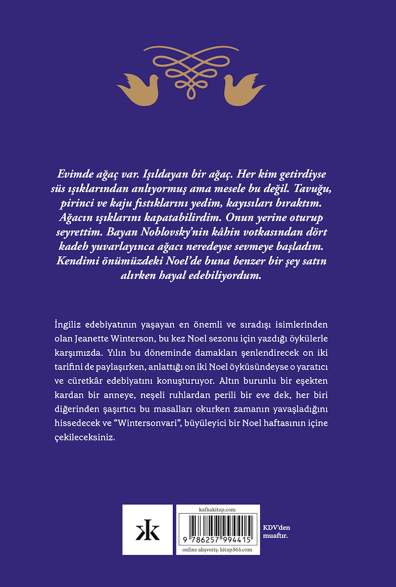 Evimde ağaç var. Işıldayan bir ağaç. Her kim getirdiyse süs ışıklarından anlıyormuş ama mesele bu değil. Tavuğu, pirinci ve kaju fıstıklarını yedim, kayısıları bıraktım. Ağacın ışıklarını kapatabilirdim. Onun yerine oturup seyrettim. Bayan Noblovsky’nin kâhin votkasından dört kadeh yuvarlayınca ağacı neredeyse sevmeye başladım. Kendimi önümüzdeki Noel’de buna benzer bir şey satın alırken hayal edebiliyordum. İngiliz edebiyatının yaşayan en önemli ve sıradışı isimlerinden olan Jeanette Winterson, bu kez Noel sezonu için yazdığı öykülerle karşımızda. Yılın bu döneminde damakları şenlendirecek on iki tarifini de paylaşırken, anlattığı on iki Noel öyküsündeyse o yaratıcı ve cüretkâr edebiyatını konuşturuyor. Altın burunlu bir eşekten kardan bir anneye, neşeli ruhlardan perili bir eve dek, her biri diğerinden şaşırtıcı bu masalları okurken zamanın yavaşladığını hissedecek ve “Wintersonvari”, büyüleyici bir Noel haftasının içine çekileceksiniz.