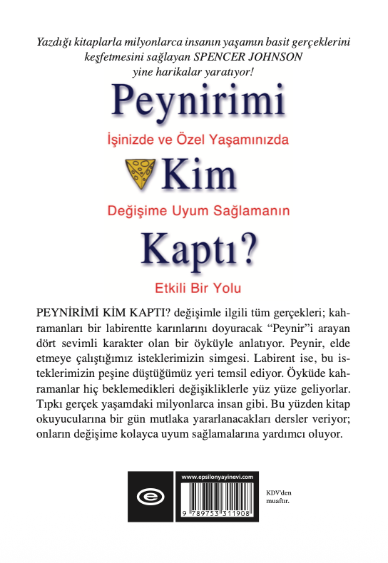44 dilde 30 milyondan fazla satan bir kişisel gelişim klasiği! Yazdığı kitaplarla milyonlarca insanın yaşamın basit gerçeklerini keşfetmesini sağlayan Spencer Johnson yine harikalar yaratıyor! Tüm dünyada 30 milyon kopyadan fazla satan bu klasikleşmiş eser hem işlerinizde hem de özel yaşamınızda size yepyeni kapılar açacak. Peynirimi Kim Kaptı? Değişimle ilgili tüm gerçekleri; kahramanları bir labirentte karınlarını doyuracak “Peynir”i arayan dört sevimli karakter olan bir öyküyle anlatıyor. Peynir, elde etmeye çalıştığımız isteklerimizin simgesi. Labirent ise, bu isteklerimizin peşine düştüğümüz yeri temsil ediyor.