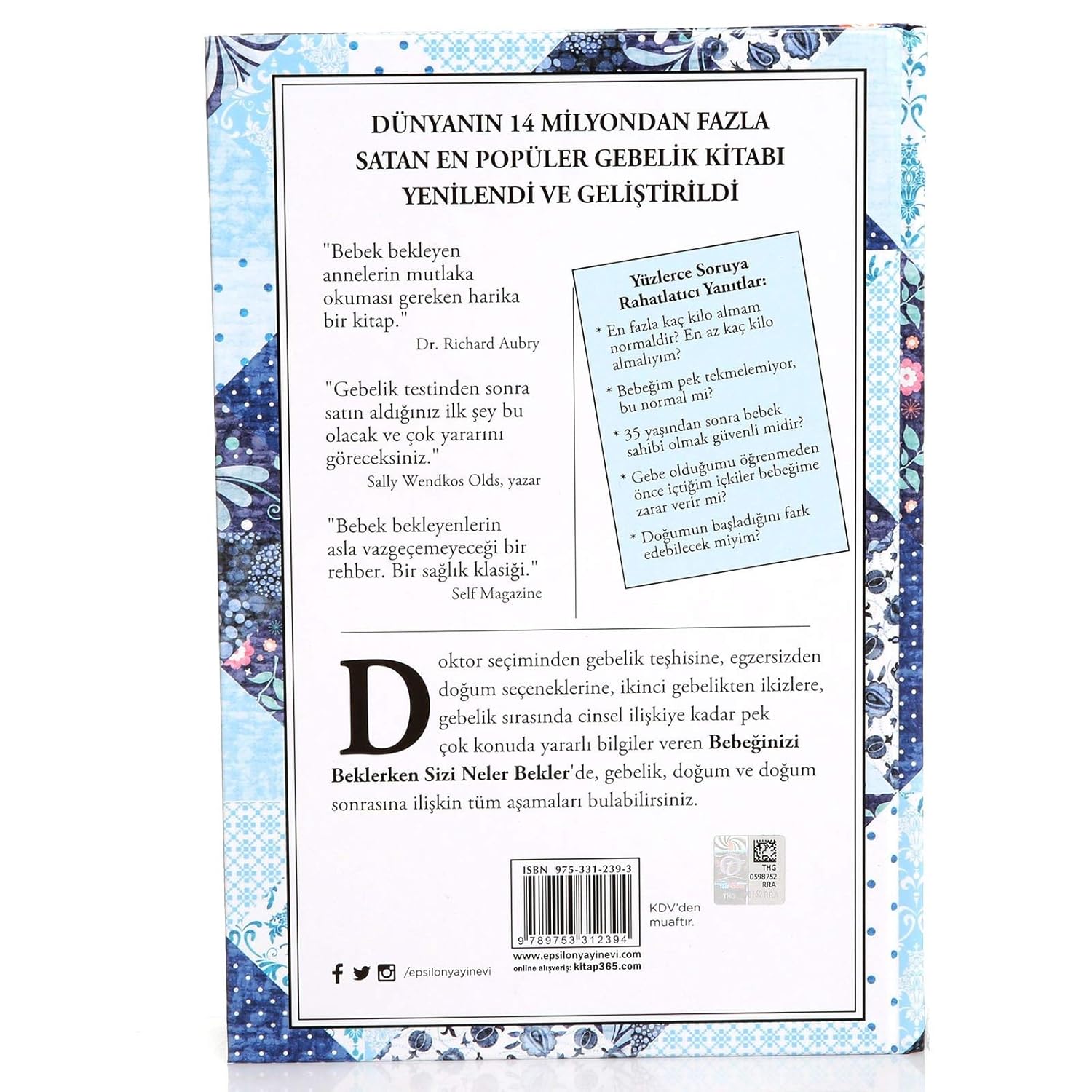 DÜNYANIN 14 MİLYONDAN FAZLASATAN EN POPÜLER GEBELİK KİTABI YENİLENDİ VE GELİŞTİRİLDİ Doktor seçiminden gebelik teşhisine, egzersizden doğum seçeneklerine, ikinci gebelikten ikizlere, gebelik sırasında cinsel ilişkiye kadar pek çok konuda yararlı bilgiler veren Bebeğinizi Beklerken Sizi Neler Bekler'de, gebelik, doğum ve doğum sonrasına ilişkin tüm aşamaları bulabilirsiniz. Yüzlerce Soruya Rahatlatıcı Yanıtlar: En fazla kaç kilo almam normaldir? En az kaç kilo almalıyım? Bebeğim pek tekmelemiyor, bu normal mi? 35 yaşından sonra bebeksahibi olmak güvenli midir? Gebe olduğumu öğrenmeden önce içtiğim içkiler bebeğime zarar verir mi? Doğumun başladığını fark edebilecek miyim?