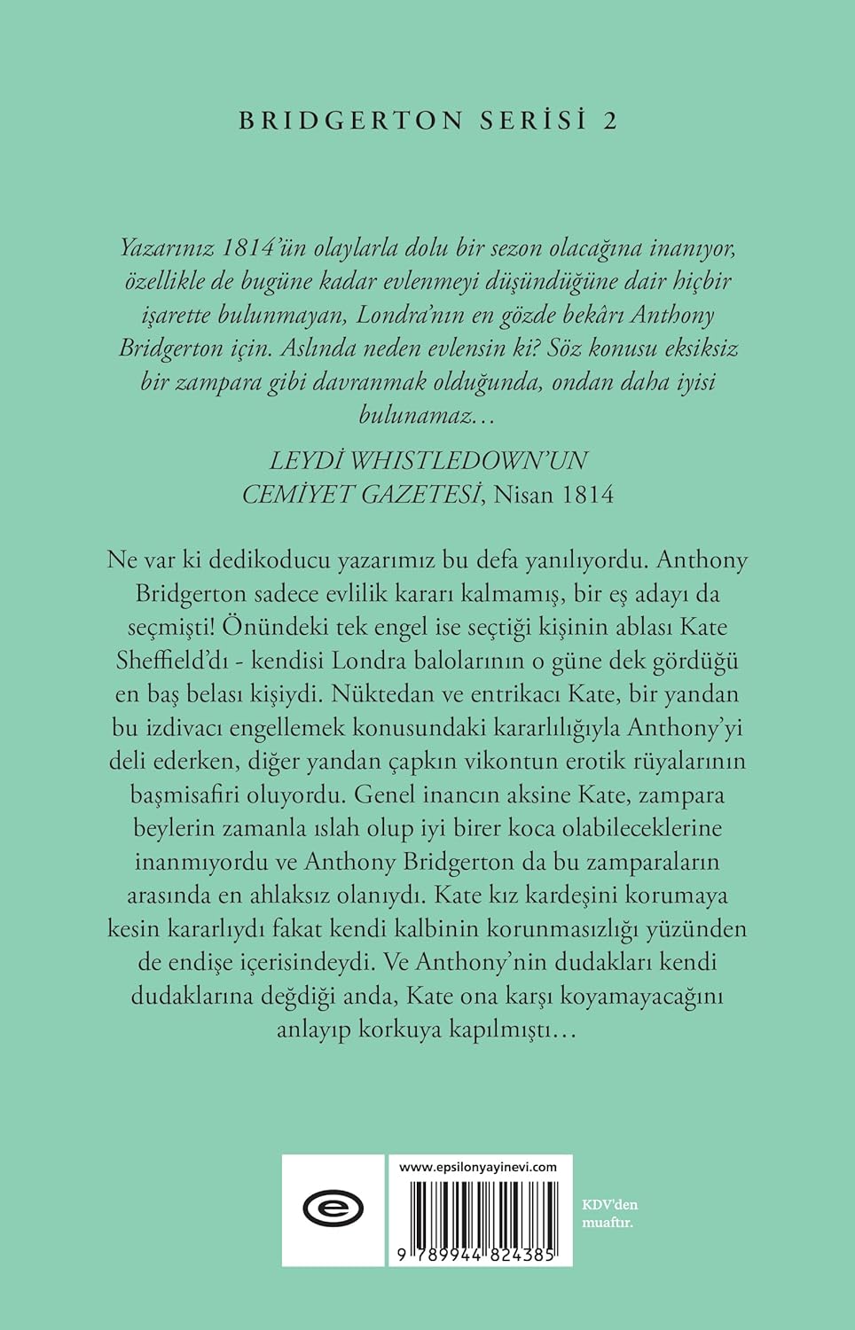 BRIDGERTON SERİSİ 2 Yazarınız 1814’ün olaylarla dolu bir sezon olacağına inanıyor, özellikle de bugüne kadar evlenmeyi düşündüğüne dair hiçbir işarette bulunmayan, Londra’nın en gözde bekârı Anthony Bridgerton için. Aslında neden evlensin ki? Söz konusu eksiksiz bir zampara gibi davranmak olduğunda, ondan daha iyisi bulunamaz... LEYDİ WHISTLEDOWN’UN CEMİYET GAZETESİ, Nisan 1814 Ne var ki dedikoducu yazarımız bu defa yanılıyordu. Anthony Bridgerton sadece evlilik kararı kalmamış, bir eş adayı da seçmişti! Önündeki tek engel ise seçtiği kişinin ablası Kate Sheffield’dı - kendisi Londra balolarının o güne dek gördüğü en baş belası kişiydi. Nüktedan ve entrikacı Kate, bir yandan bu izdivacı engellemek konusundaki kararlılığıyla Anthony’yi deli ederken, diğer yandan çapkın vikontun erotik rüyalarının başmisafiri oluyordu. Genel inancın aksine Kate, zampara beylerin zamanla ıslah olup iyi birer koca olabileceklerine inanmıyordu ve Anthony Bridgerton da bu zamparaların arasında en ahlaksız olanıydı. Kate kız kardeşini korumaya kesin kararlıydı fakat kendi kalbinin korunmasızlığı yüzünden de endişe içerisindeydi. Ve Anthony’nin dudakları kendi dudaklarına değdiği anda, Kate ona karşı koyamayacağını anlayıp korkuya kapılmıştı...