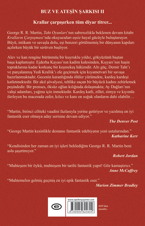 BUZ VE ATEŞİN ŞARKISI II Krallar çarpışırken tüm diyar titrer... George R. R. Martin, Taht Oyunları'nın sabırsızlıkla beklenen devam kitabı Kralların Çarpışması'nda okuyucuları eşsiz hayal gücüyle buluşturuyor. Büyü, intikam ve savaşla dolu, eşi benzeri görülmemiş bir dünyanın kapıları açılırken büyük bir serüven başlıyor. Alev ve kan rengine bürünmüş bir kuyruklu yıldız, gökyüzünü baştan başa kaplamıştır. Ejderha Kayası'nın kadim kalesinden, Kışyarı'nın haşin topraklarına kadar korkunç bir keşmekeş hâkimdir. Altı güç, Demir Taht'ı ve parçalanmış Yedi Krallık'ı ele geçirmek için kıyametvari bir savaşa hazırlanmaktadır. Gecenin karanlığında ölüler yürümekte, kardeş kardeşi katletmektedir. Bir akıl şövalyesi, tehlike saçan bir büyücü kadını zehirlemek peşindedir. Bir prenses, öksüz oğlan kılığında dolaşmakta; Ay Dağları'nın vahşi adamları, yağma için inmektedir. Kardeş katli, zillet, simya ve kıyımla ilerleyen bu macerada zafer, kılıcı ve kanı en soğuk olanların dahi olabilir... "Martin, birinci ciltteki vaadini fazlasıyla yerine getiriyor ve yazılmış en iyi fantastik eser olmaya aday serisine devam ediyor." The Denver Post "George Martin kesinlikle destansı fantastik edebiyatın yeni ustalarından." Katharine Kerr "Kendisinden her zaman en iyi işleri beklediğim George R. R. Martin beni asla şaşırtmıyor." Robert Jordan "Muhteşem bir öykü, muhteşem bir tarihi fantastik yapıt! Göz kamaştırıcı." Anne McCaffrey "Muhtemelen gelmiş geçmiş en iyi epik fantastik eser." Marion Zimmer Bradley