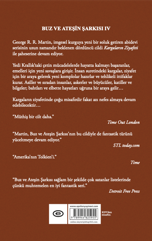 George R. R. Martin, imgesel kurguya yeni bir soluk getiren abidevi serisinin uzun zamandır beklenen dördüncü cildi Kargaların Ziyafeti ile şaheserine devam ediyor. Yedi Krallıktaki çetin mücadelelerde hayatta kalmayı başaranlar, emelleri için yeni savaşlara girişir. İnsan suretindeki kargalar, ziyafet için bir araya gelerek yeni komplolar hazırlar ve tehlikeli ittifaklar kurar. Asiller ve sıradan insanlar, askerler ve büyücüler, katiller ve bilgeler; bahtları ve elbette hayatları uğruna bir araya gelir Kargaların ziyafetinde çoğu misafirdir fakat azı nefes almaya devam edebilecektir Müthiş bir cilt daha. Time Out London Martin, Buz ve Ateşin Şarkısının bu cildiyle de fantastik türünü yüceltmeye devam ediyor. STL today.com Amerikanın Tolkieni. Time Buz ve Ateşin Şarkısı sağlam bir şekilde çok satanlar listelerinde çünkü muhtemelen en iyi fantastik seri. Detroit Free Press