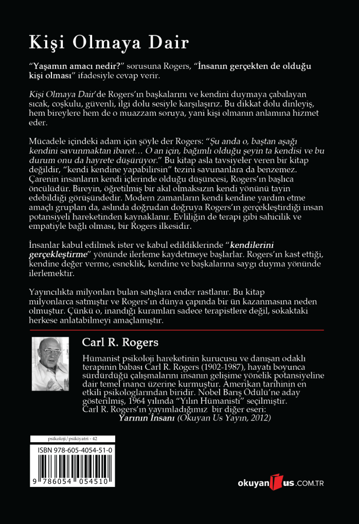 İlgiyle takip edilen Psikoloji/Psikiyatriserimizin son kitabı Kişi Olmaya Dair, Carl R. Rogers'ın en değerli kitaplarından biri olmakla beraber, psikoloji ve psikiyatri dünyasına hakim olmayan sokaktaki insanın kendini ve hayatı çözmesine yardımcı olur. Yaşamın amacı nedir? sorusuna Rogers, İnsanın gerçekten de olduğu kişi olması ifadesiyle cevap verir. Kişi Olmaya Dairde Rogersın başkalarını ve kendini duymaya çabalayan sıcak, coşkulu, güvenli, ilgi dolu sesiyle karşılaşırız. Bu dikkat dolu dinleyiş, hem bireylere hem de o muazzam soruya, yani kişi olmanın anlamına hizmet eder. Yayıncılıkta milyon rakamı ender görülen bir sayıdır. Oysa bu kitap milyonlarca satmıştır ve Rogersın dünya çapında bir ün kazanmasına neden olmuştur. Çünkü o, inandığı kuramları sadece terapistlere değil, sokaktaki herkese anlatabilmeyi amaçlamıştır.