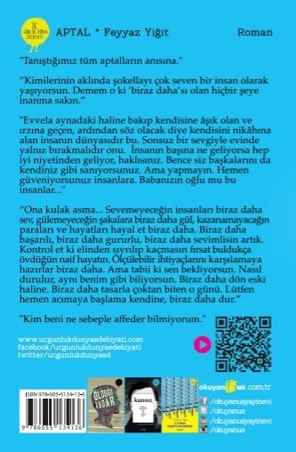 Üç Günlük Dünya Edebiyatı, APTAL ile devam ediyor. Arka Kapak: SUÇLU SEN DEĞİLSİN, KAYBEDEN BİZİZ. "Tanıştığımız tüm aptalların anısına." Kimilerinin aklında şokellayı çok seven bir insan olarak yaşıyorsun. Demem o ki biraz dahası olan hiçbir şeye inanma sakın. "Evvela aynadaki haline bakıp kendisine âşık olan ve ırzına geçen, ardından söz olacak diye kendisini nikâhına alan insanın dünyasıdır bu. Sonsuz bir sevgiyle evinde yalnız bırakmalıdır onu. İnsanın başına ne geliyorsa hep iyi niyetinden geliyor, haklısınız. Bence siz başkalarını da kendiniz gibi sanıyorsunuz. Ama yapmayın. Hemen güveniyorsunuz insanlara. Babanızın oğlu mu bu insanlar..." Ona kulak asma... Sevemeyeceğin insanları biraz daha sev, gülemeyeceğin şakalara biraz daha gül, kazanamayacağın paraları ve hayatları hayal et biraz daha. Biraz daha başarılı, biraz daha gururlu, biraz daha sevimlisin artık. Kontrol et ki elinden sıyrılıp kaçmasın fırsat buldukça övdüğün naif hayatın. Ölçülebilir ihtiyaçlarını karşılamaya hazırlar biraz daha. Ama tabii ki sen bekliyorsun. Nasıl durulur, aynı benim gibi biliyorsun. Biraz daha dön eski haline. Biraz daha tasarla çoktan biten o günü. Lütfen hemen acımaya başlama kendine, biraz daha dur. "Kim beni ne sebeple affeder bilmiyorum." Yazar Hakkında: Feyyaz Yiğit: 1988 yılında Duzcede dogdu. 1999 Duzce depreminden sonra ailecek Ankaraya yerlestiler. Ankara Anadolu Guzel Sanatlar Lisesinde Resim Bolumunde okudu. Sonra Hacettepe Universitesi Guzel Sanatlar Fakultesi Grafik Tasarım Bolumune girdi. Bitiremedi. Alttan aldıgı 7 dersi var: Sanat Sosyolojisi / Sanat Tarihi 2 / Gostergebilim / Animasyon 2 / Grafik Tarihi 2 / Tasarım Uygulama / Grafik Tasarım / Sunum Tasarımı.