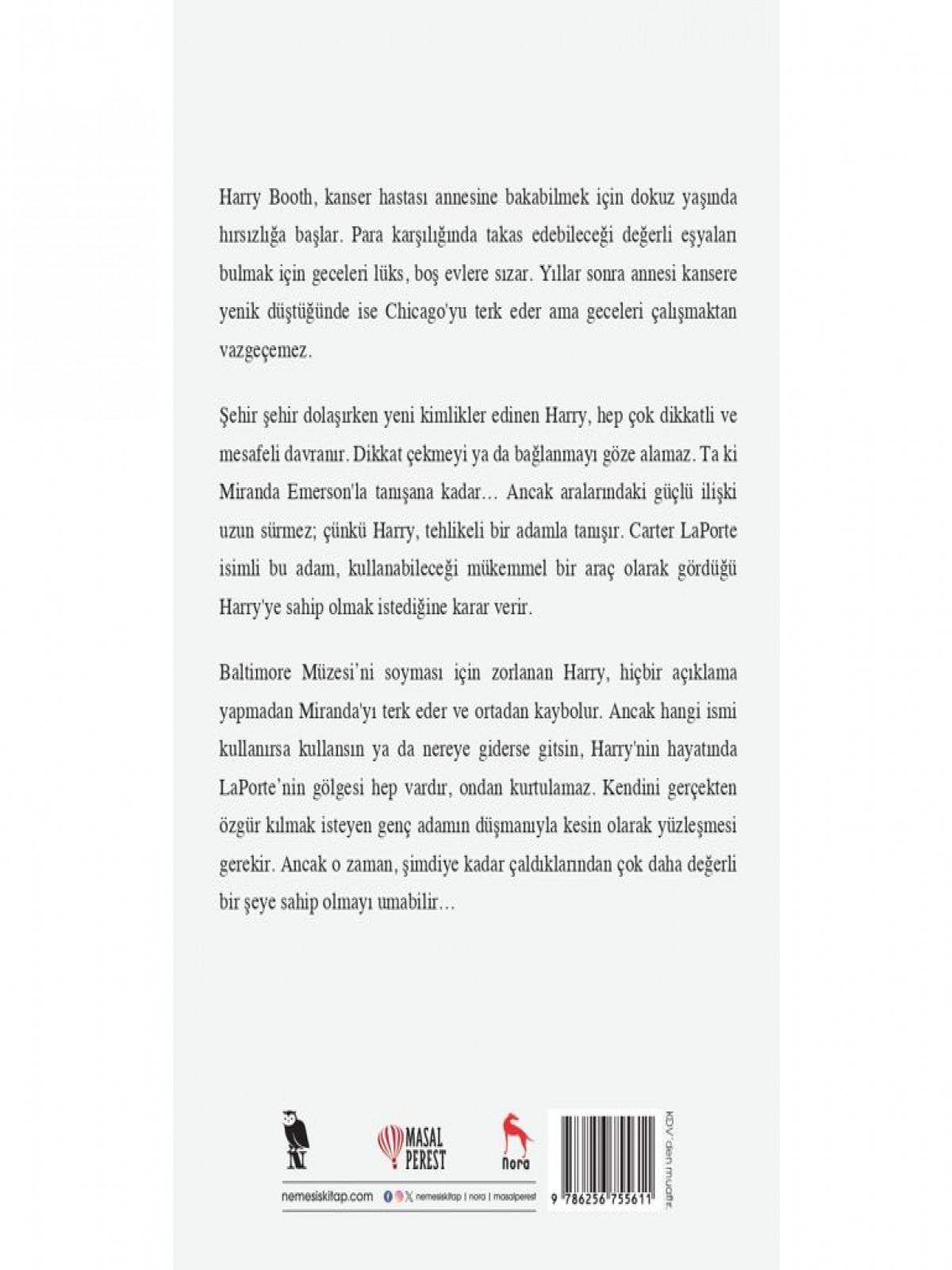 Harry Booth, kanser hastası annesine bakabilmek için dokuz yaşında hırsızlığa başlar. Para karşılığında takas edebileceği değerli eşyaları bulmak için geceleri lüks, boş evlere sızar. Yıllar sonra annesi kansere yenik düştüğünde ise Chicago'yu terk eder ama geceleri çalışmaktan vazgeçemez. Şehir şehir dolaşırken yeni kimlikler edinen Harry, hep çok dikkatli ve mesafeli davranır. Dikkat çekmeyi ya da bağlanmayı göze alamaz. Ta ki Miranda Emerson'la tanışana kadar... Ancak aralarındaki güçlü ilişki uzun sürmez; çünkü Harry, tehlikeli bir adamla tanışır. Carter LaPorte isimli bu adam, kullanabileceği mükemmel bir araç olarak gördüğü Harry'ye sahip olmak istediğine karar verir. Baltimore Müzesi’ni soyması için zorlanan Harry, hiçbir açıklama yapmadan Miranda'yı terk eder ve ortadan kaybolur. Ancak hangi ismi kullanırsa kullansın ya da nereye giderse gitsin, Harry'nin hayatında LaPorte’nin gölgesi hep vardır, ondan kurtulamaz. Kendini gerçekten özgür kılmak isteyen genç adamın düşmanıyla kesin olarak yüzleşmesi gerekir. Ancak o zaman, şimdiye kadar çaldıklarından çok daha değerli bir şeye sahip olmayı umabilir...