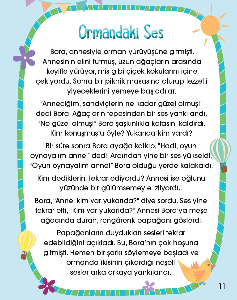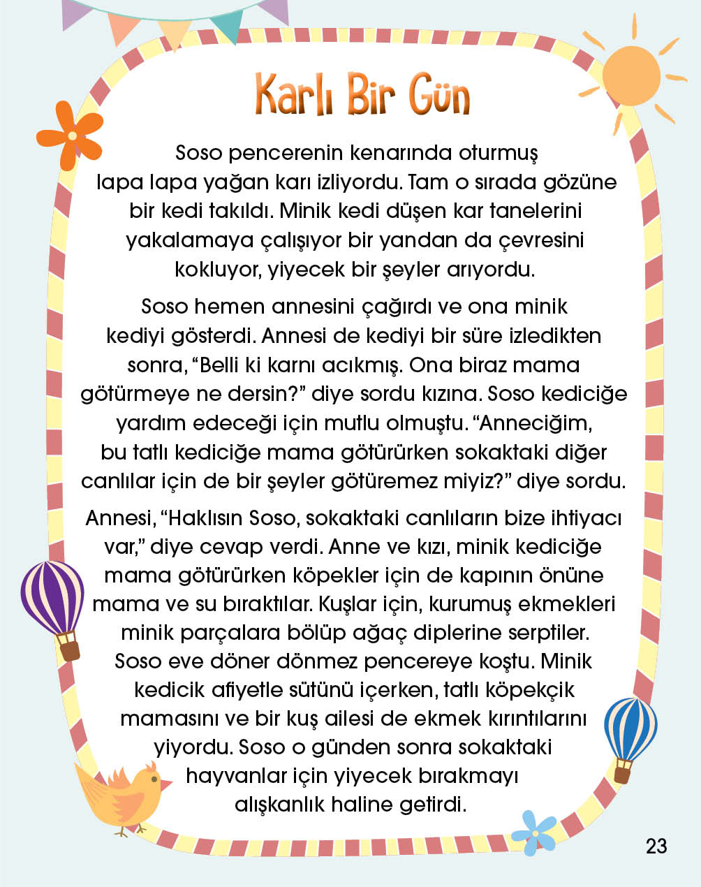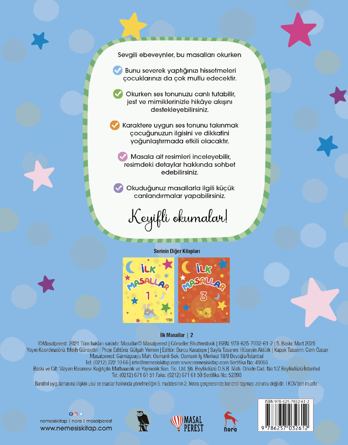 Sevgili ebeveynler, bu masalları okurken ü Bunu severek yaptığınızı hissetmeleri çocuklarınızı da çok mutlu edecektir. ü Okurken ses tonunuzu canlı tutabilir, jest ve mimiklerinizle hikâye akışını destekleyebilirsiniz. ü Karaktere uygun ses tonunu takınmak çocuğunuzun ilgisini ve dikkatini yoğunlaştırmada etkili olacaktır. ü Masala ait resimleri inceleyebilir, resimdeki detaylar hakkında sohbet edebilirsiniz. ü Okuduğunuz masallarla ilgili küçük canlandırmalar yapabilirsiniz. Keyifli okumalar!