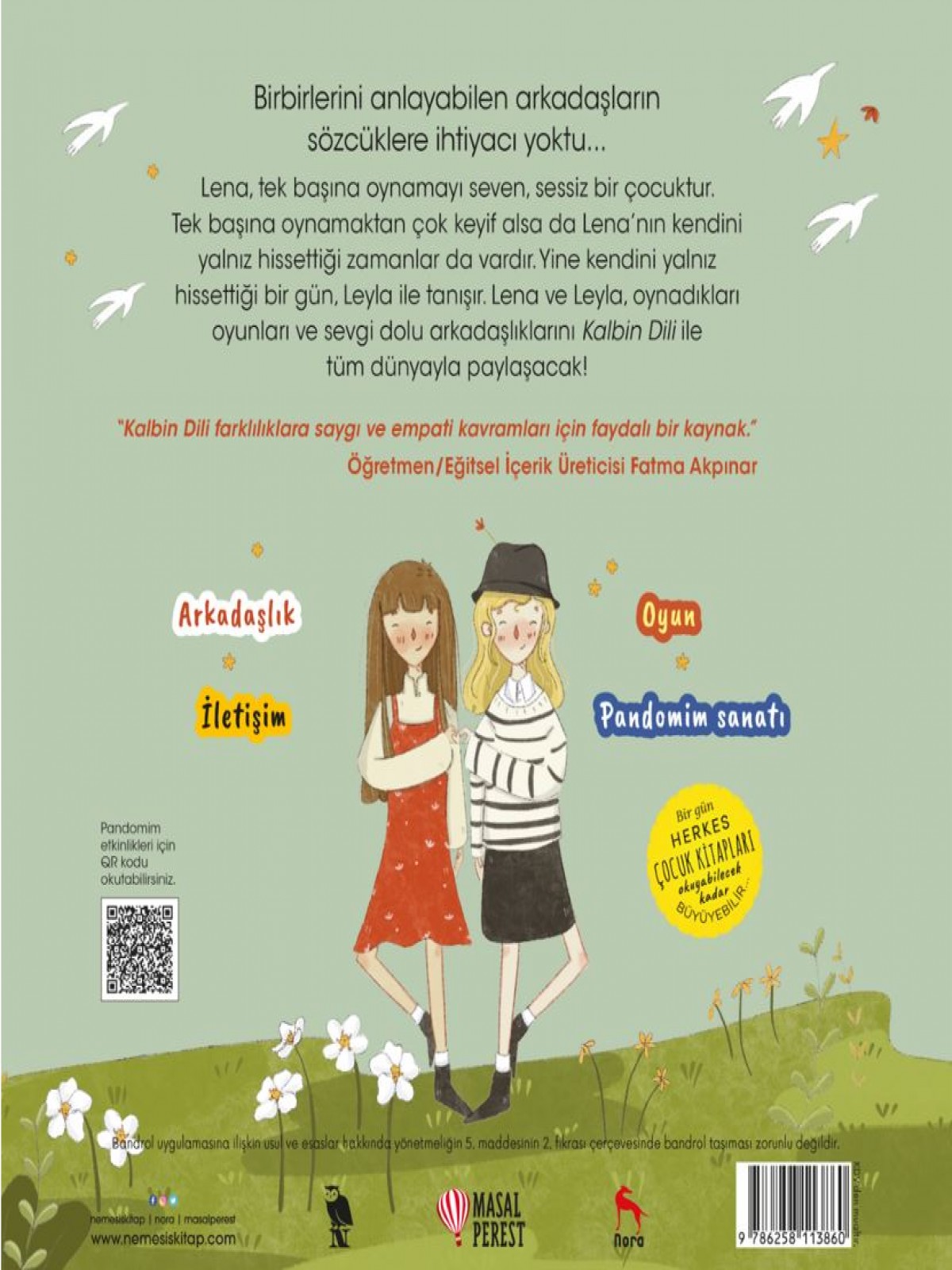Birbirlerini anlayabilen arkadaşlarınsözcüklere ihtiyacı yoktu...Lena, tek başına oynamayı seven, sessiz bir çocuktur.Tek başına oynamaktan çok keyif alsa da Lena’nın kendiniyalnız hissettiği zamanlar da vardır. Yine kendini yalnızhissettiği bir gün, Leyla ile tanışır. Lena ve Leyla, oynadıklarıoyunları ve sevgi dolu arkadaşlıklarını Kalbin Dili iletüm dünyayla paylaşacak!“Kalbin Dili farklılıklara saygı ve empati kavramları için faydalı bir kaynak.”Öğretmen/Eğitsel İçerik Üreticisi Fatma Akpınar