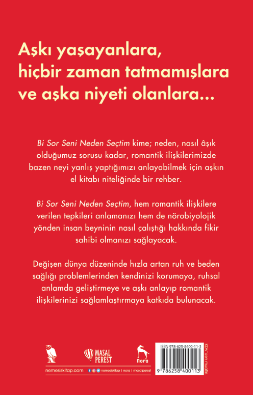 Aşkı yaşayanlara, hiçbir zaman tatmamışlara ve aşka niyeti olanlara… Bi Sor Seni Neden Seçtim kime; neden, nasıl âşık olduğumuz sorusu kadar, romantik ilişkilerimizde bazen neyi yanlış yaptığımızı anlayabilmek için aşkın el kitabı niteliğinde bir rehber. Bi Sor Seni Neden Seçtim, hem romantik ilişkilere verilen tepkileri anlamanızı hem de nörobiyolojik yönden insan beyninin nasıl çalıştığı hakkında fikir sahibi olmanızı sağlayacak. Değişen dünya düzeninde hızla artan ruh ve beden sağlığı problemlerinden kendinizi korumaya, ruhsal anlamda geliştirmeye ve aşkı anlayıp romantik ilişkilerinizi sağlamlaştırmaya katkıda bulunacak.