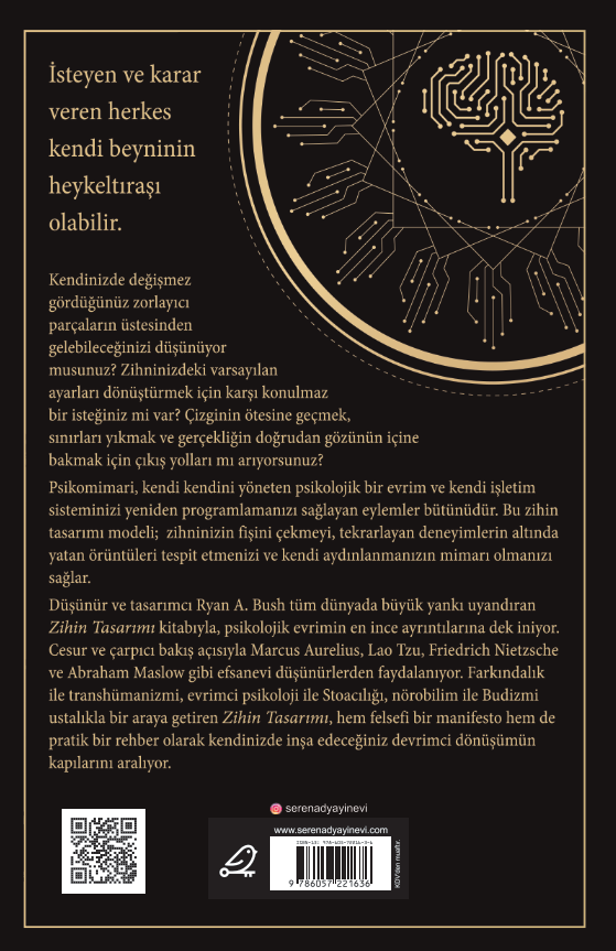 İsteyen ve karar veren herkes kendi beyninin heykeltıraşı olabilir. Kendinizde değişmez gördüğünüz zorlayıcı parçaların üstesinden gelebileceğinizi düşünüyor musunuz? Zihninizdeki varsayılan ayarları dönüştürmek için karşı konulmaz bir isteğiniz mi var? Çizginin ötesine geçmek, sınırları yıkmak ve gerçekliğin doğrudan gözünün içine bakmak için çıkış yolları mı arıyorsunuz? Psikomimari, kendi kendini yöneten psikolojik bir evrim ve kendi işletim sisteminizi yeniden programlamanızı sağlayan eylemler bütünüdür. Bu zihin tasarımı modeli, kendi zihninizin fişini çekmenizi, tekrarlayan deneyimlerin altında yatan örüntüleri tespit etmenizi ve kendi aydınlanmanızın mimarı olmanızı sağlar. Düşünür ve tasarımcı Ryan A Bush tüm dünyada geniş yankı uyandıran Zihin Tasarımı kitabıyla , psikolojik evrimin en ince ayrıntılarına dek inerek, cesur ve çarpıcı bakış açısıyla Marcus Aurelius, Lao Tzu, Friedrich Nietzsche ve Abraham Maslow gibi efsanevi düşünürlerden faydalanıyor. Farkındalıkla transhümanizmi, evrimci psikolojiyle Stoacılığı ve nörobilimle Budizmi ustalıkla bir araya getiren bu kitap hem felsefi bir manifesto hem de pratik bir rehberi olarak kendinizde inşa edeceğiniz devrimc dönüşümün kapılarını aralıyor.