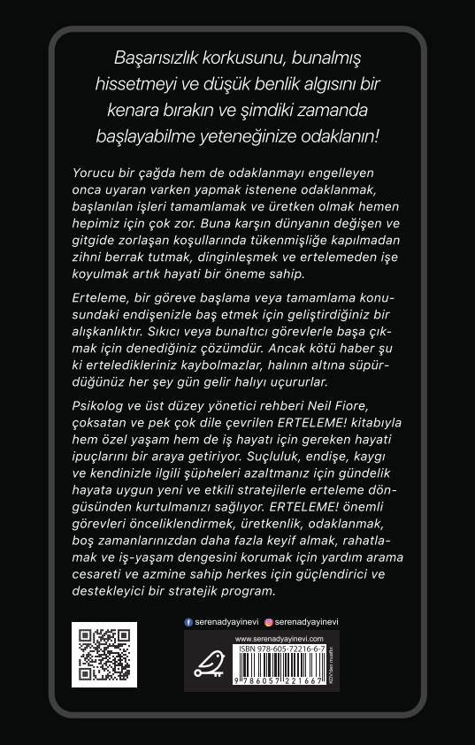 Ertelemenin Üstesinden Gelmek ve Suçluluk Hissetmeden Eğlenmenin Keyfini Çıkarmak NEIL A. FIORE, PH.D Başarısızlık korkusunu, bunalmış hissetmeyi ve düşük benlik algısını bir kenara bırakın ve şimdiki zamanda başlayabilme yeteneğinize odaklanın! Yorucu bir çağda hem de odaklanmayı engelleyen onca uyaran varken yapmak istenene odaklanmak, başlanılan işleri tamamlamak ve üretken olmak hemen hepimiz için çok zor. Buna karşın dünyanın değişen ve gitgide zorlaşan koşullarında tükenmişliğe kapılmadan zihni berrak tutmak, dinginleşmek ve ertelemeden işe koyulmak artık hayati bir öneme sahip. Erteleme, bir göreve başlama veya tamamlama konusundaki endişenizle baş etmek için geliştirdiğiniz bir alışkanlıktır. Sıkıcı veya bunaltıcı görevlerle başa çıkmak için denediğiniz çözümdür. Ancak kötü haber şu ki erteledikleriniz kaybolmazlar, halının altına süpürdüğünüz her şey gün gelir halıyı uçururlar. Psikolog ve üst düzey yönetici rehberi Neil Fiore, çoksatan ve pek çok dile çevrilen ERTELEME! kitabıyla hem özel yaşam hem de iş hayatı için gereken hayati ipuçlarını bir araya getiriyor. Suçluluk, endişe, kaygı ve kendinizle ilgili şüpheleri azaltmanız için gündelik hayata uygun yeni ve etkili stratejilerle erteleme döngüsünden kurtulmanızı sağlıyor. ERTELEME! önemli görevleri önceliklendirmek, üretkenlik, odaklanmak, boş zamanlarınızdan daha fazla keyif almak, rahatlamak ve iş-yaşam dengesini korumak için yardım arama cesareti ve azmine sahip herkes için güçlendirici ve destekleyici bir stratejik program.