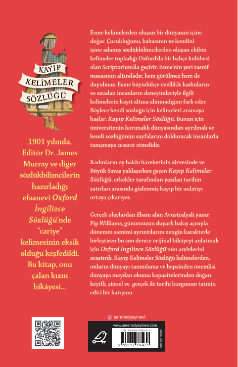 1901 yılında, Editör Dr. James Murray ve diğer sözlükbilimcilerin hazırladığı efsanevi Oxford İngilizce Sözlüğü'nde “cariye” kelimesinin eksik olduğu keşfedildi. Bu kitap, onu çalan kızın hikâyesi… Esme, kelimelerden oluşan bir dünyanın içine doğar. Çocukluğunu, babasının ve kendini işine adamış sözlükbilimcilerden oluşan ekibin kelimeler topladığı Oxford’da bir bahçe kulübesi olan Scriptorium'da geçirir. Esme'nin yeri tasnif masasının altındadır, hem görülmez hem de duyulmaz. Esme büyüdükçe özellikle kadınların ve sıradan insanların deneyimleriyle ilgili kelimelerin kayıt altına alınmadığını fark eder. Böylece kendi sözlüğü için kelimeleri aramaya başlar: Kayıp Kelimeler Sözlüğü. Bunun için üniversitenin korunaklı dünyasından ayrılmalı ve kendi sözlüğünün sayfalarını dolduracak insanlarla tanışmaya cesaret etmelidir. Kadınların oy hakkı hareketinin zirvesinde ve Büyük Savaş yaklaşırken geçen Kayıp Kelimeler Sözlüğü, erkekler tarafından yazılan tarihin satırları arasında gizlenmiş kayıp bir anlatıyı ortaya çıkarıyor. Gerçek olaylardan ilham alan Avustralyalı yazar Pip Williams, günümüzün duyarlı bakış açısıyla dönemin samimi ayrıntılarını zengin karakterle birleştiren bu son derece orijinal hikâyeyi anlatmak için Oxford İngilizce Sözlüğü'nün arşivlerini araştırdı. Kayıp Kelimeler Sözlüğü kelimelerden, onların dünyayı tanımlama ve hepsinden önemlisi dünyaya meydan okuma kapasitelerinden doğan keyifli, şiirsel ve gerçek ile tarihi kurgunun tatmin edici bir karışımı.