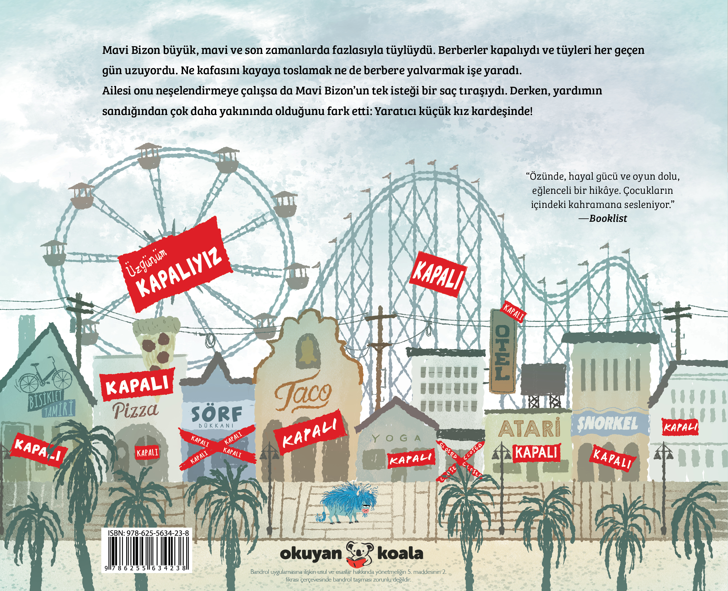 Mavi Bizon Tıraş Olmak İstiyor, sabretmenin zorluğunu görünür kılarken; beklerken hissedilen çaresizlik ve öfke gibi duygulara empatiyle yaklaşıyor. Tıpkı küçük kardeş Baloncuk Bizon’un olduğu gibi olaylara mizahi bir perspektiften bakabilmenin ve esnek düşünmenin, çoğu zaman yaratıcı çözümlere nasıl kapı açtığını tüm okuyucularına model oluyor. Ve her şeyin ötesinde, kardeşler arasındaki dayanışmanın küçük krizleri nasıl çözüme ulaştırabileceğini sıcacık hikayesi aracılığıyla çocuklarla buluşturuyor.