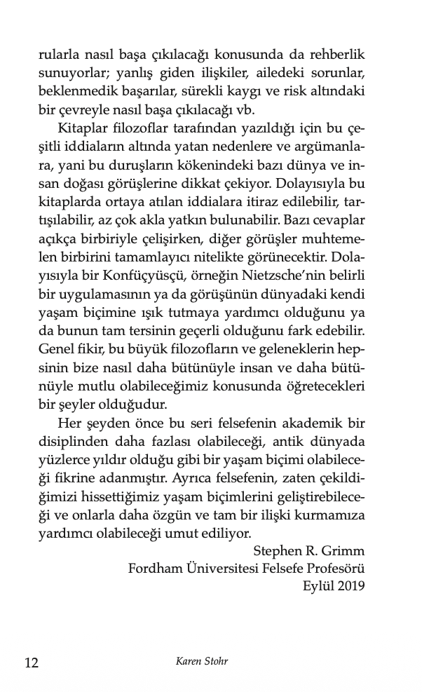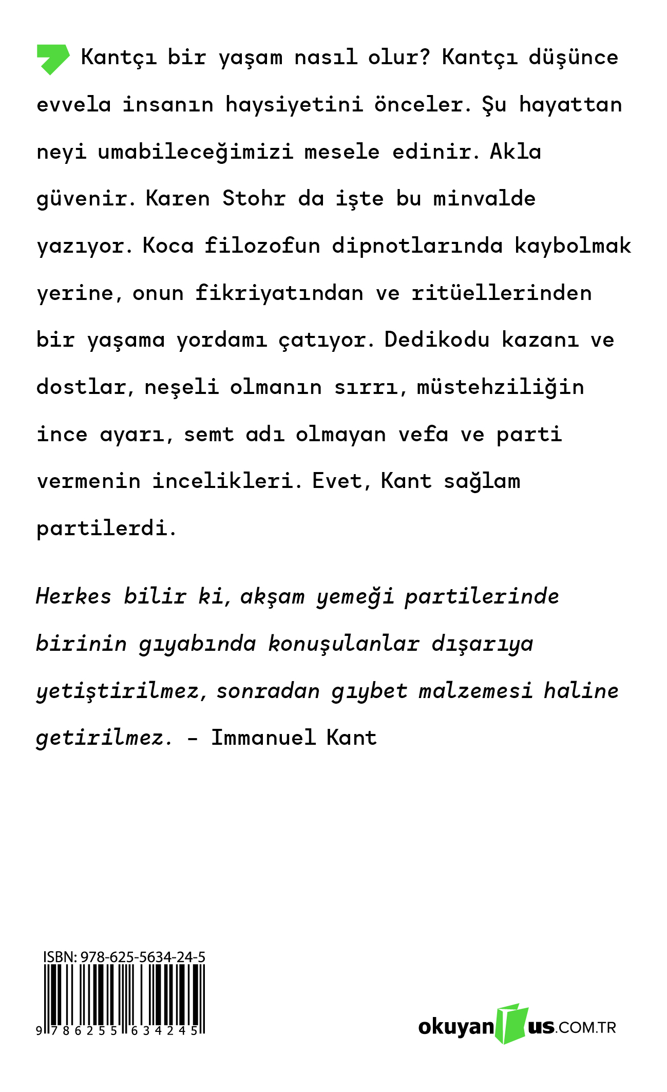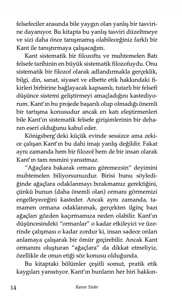 Stohr’un en büyük başarısı, Kant’ın kuramlarını gündelik hayatta karşılaştığımız en sıradan gibi görünen anlarla buluşturması. Bir arkadaşımıza teşekkür ederken, sofrada gösterdiğimiz nezakette ya da küçümseyici bir tavırla karşılaştığımızda aslında Kant’ın ahlak anlayışının izlerini görebileceğimizi hatırlatıyor.