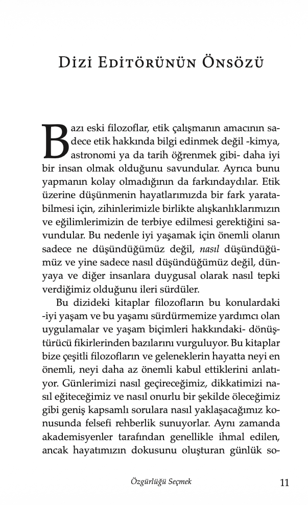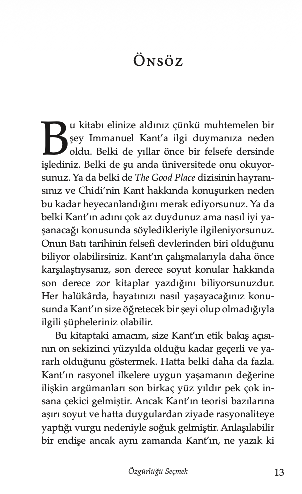 Özgürlüğü Seçmek, felsefeyi hayatımıza katmak isteyen herkes için güçlü bir davet. Kitap, hem Kant’a giriş yapmak isteyen okurlar hem de yaşamını daha bilinçli ve sorumlu şekilde yaşamak isteyenler için eşsiz bir kaynak.
