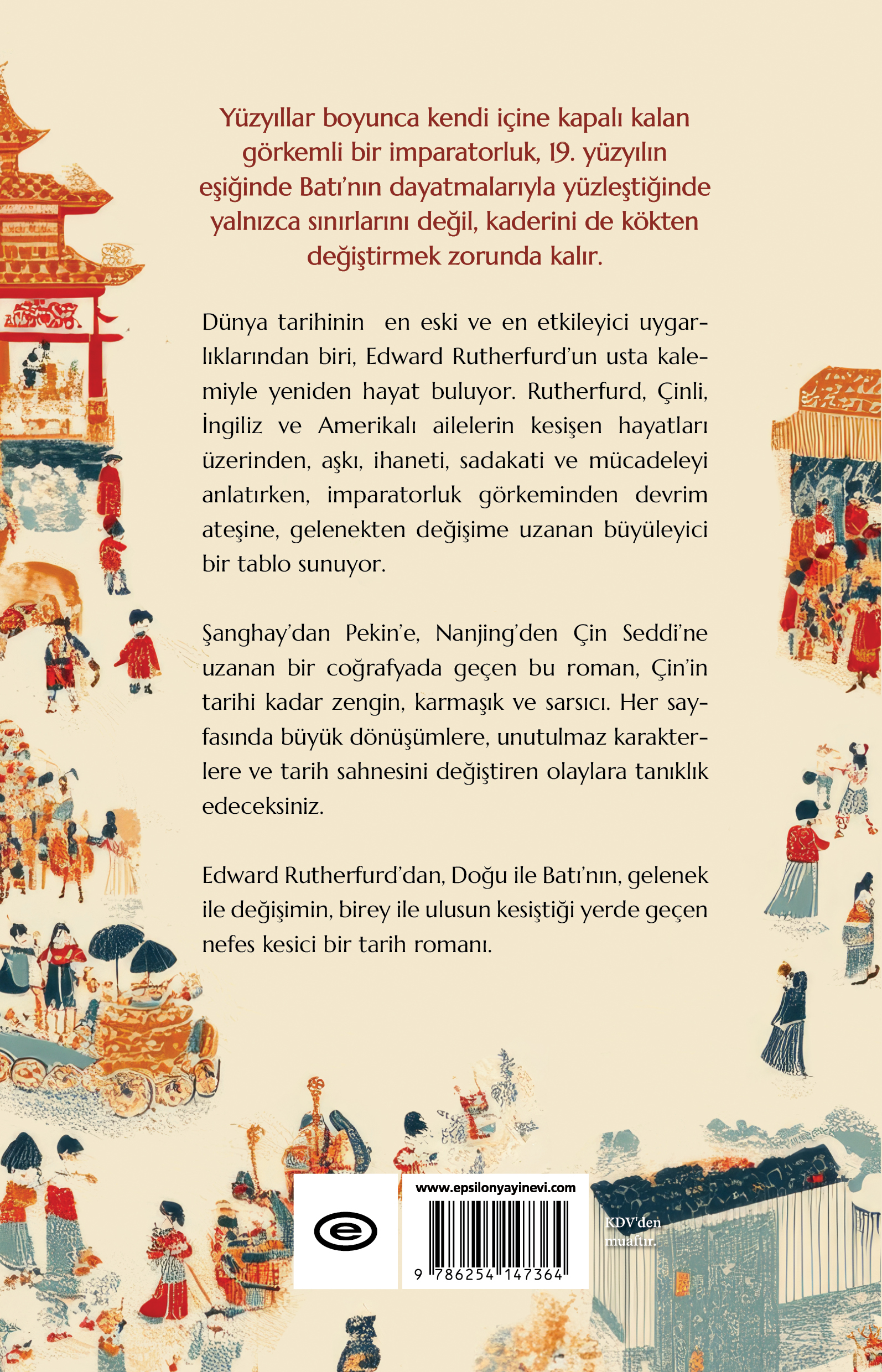 Dünya tarihinin en eski ve en etkileyici uygarlıklarından biri, Edward Rutherfurd’un usta kalemiyle yeniden hayat buluyor. Rutherfurd, Çinli, İngiliz ve Amerikalı ailelerin kesişen hayatları üzerinden, aşkı, ihaneti, sadakati ve mücadeleyi anlatırken, imparatorluk görkeminden devrim ateşine, gelenekten değişime uzanan büyüleyici bir tablo sunuyor.