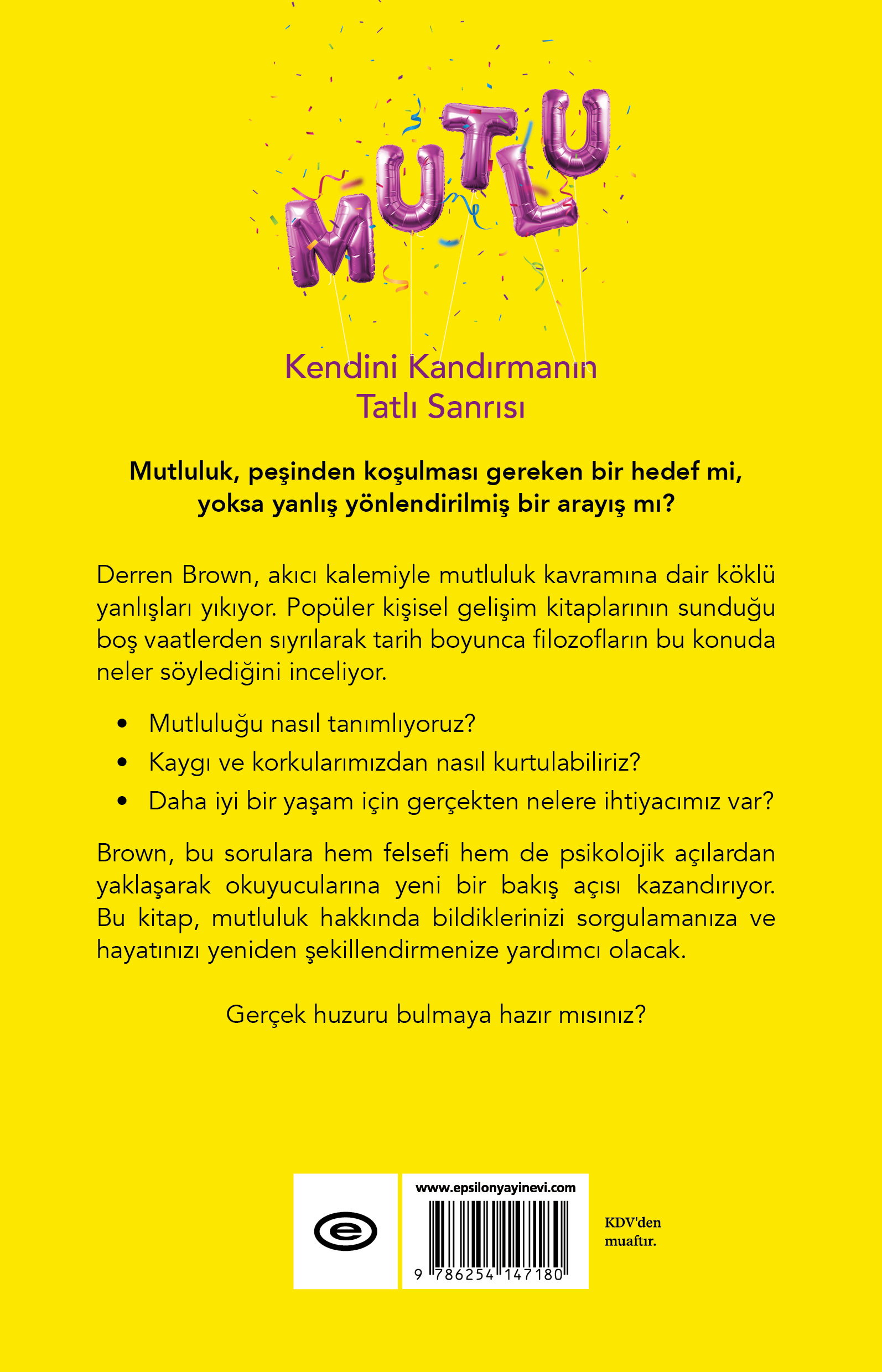 Derren Brown, akıcı kalemiyle mutluluk kavramına dair köklü yanlışları yıkıyor. Popüler kişisel gelişim kitaplarının sunduğu boş vaatlerden sıyrılarak tarih boyunca filozofların bu konuda neler söylediğini inceliyor.