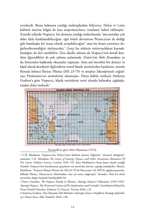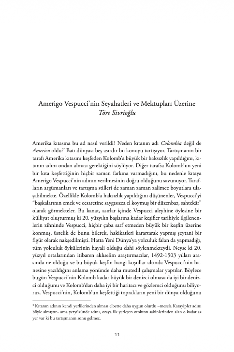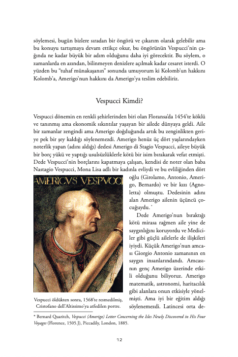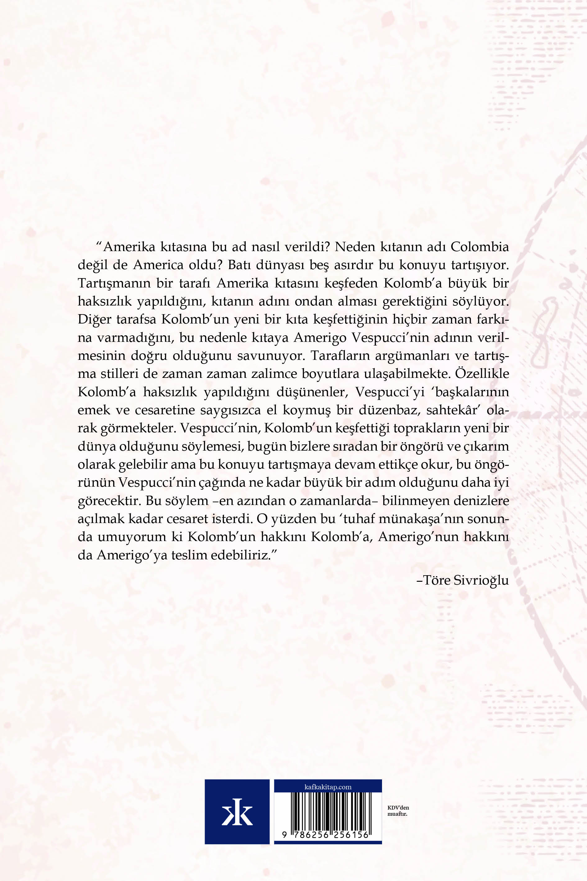 “Amerika kıtasına bu ad nasıl verildi? Neden kıtanın adı Colombia değil de America oldu? Batı dünyası beş asırdır bu konuyu tartışıyor. Tartışmanın bir tarafı Amerika kıtasını keşfeden Kolomb’a büyük bir haksızlık yapıldığını, kıtanın adını ondan alması gerektiğini söylüyor. Diğer tarafsa Kolomb’un yeni bir kıta keşfettiğinin hiçbir zaman farkına varmadığını, bu nedenle kıtaya Amerigo Vespucci’nin adının verilmesinin doğru olduğunu savunuyor. Tarafların argümanları ve tartışma stilleri de zaman zaman zalimce boyutlara ulaşabilmekte. Özellikle Kolomb’a haksızlık yapıldığını düşünenler, Vespucci’yi ‘başkalarının emek ve cesaretine saygısızca el koymuş bir düzenbaz, sahtekâr’ olarak görmekteler. Vespucci’nin, Kolomb’un keşfettiği toprakların yeni bir dünya olduğunu söylemesi, bugün bizlere sıradan bir öngörü ve çıkarım olarak gelebilir ama bu konuyu tartışmaya devam ettikçe okur, bu öngörünün Vespucci’nin çağında ne kadar büyük bir adım olduğunu daha iyi görecektir. Bu söylem –en azından o zamanlarda– bilinmeyen denizlere açılmak kadar cesaret isterdi. O yüzden bu ‘tuhaf münakaşa’nın sonunda umuyorum ki Kolomb’un hakkını Kolomb’a, Amerigo’nun hakkını da Amerigo’ya teslim edebiliriz.”