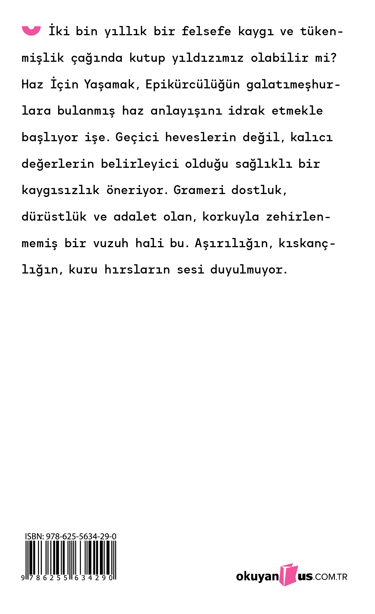 Yaşadığımız çağda mutluluk neredeyse tamamen “dışsal başarılarla” ölçülüyor. Haz İçin Yaşamak bize, gerçek mutluluğun aslında kendi yaşam biçimimizi yeniden kurgulamakta saklı olduğunu hatırlatıyor. Epikür’ün binlerce yıl öncesinden gelen bu mesajı, bugün belki de hiç olmadığı kadar güncel.