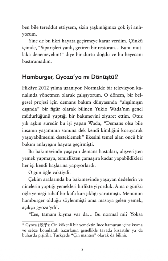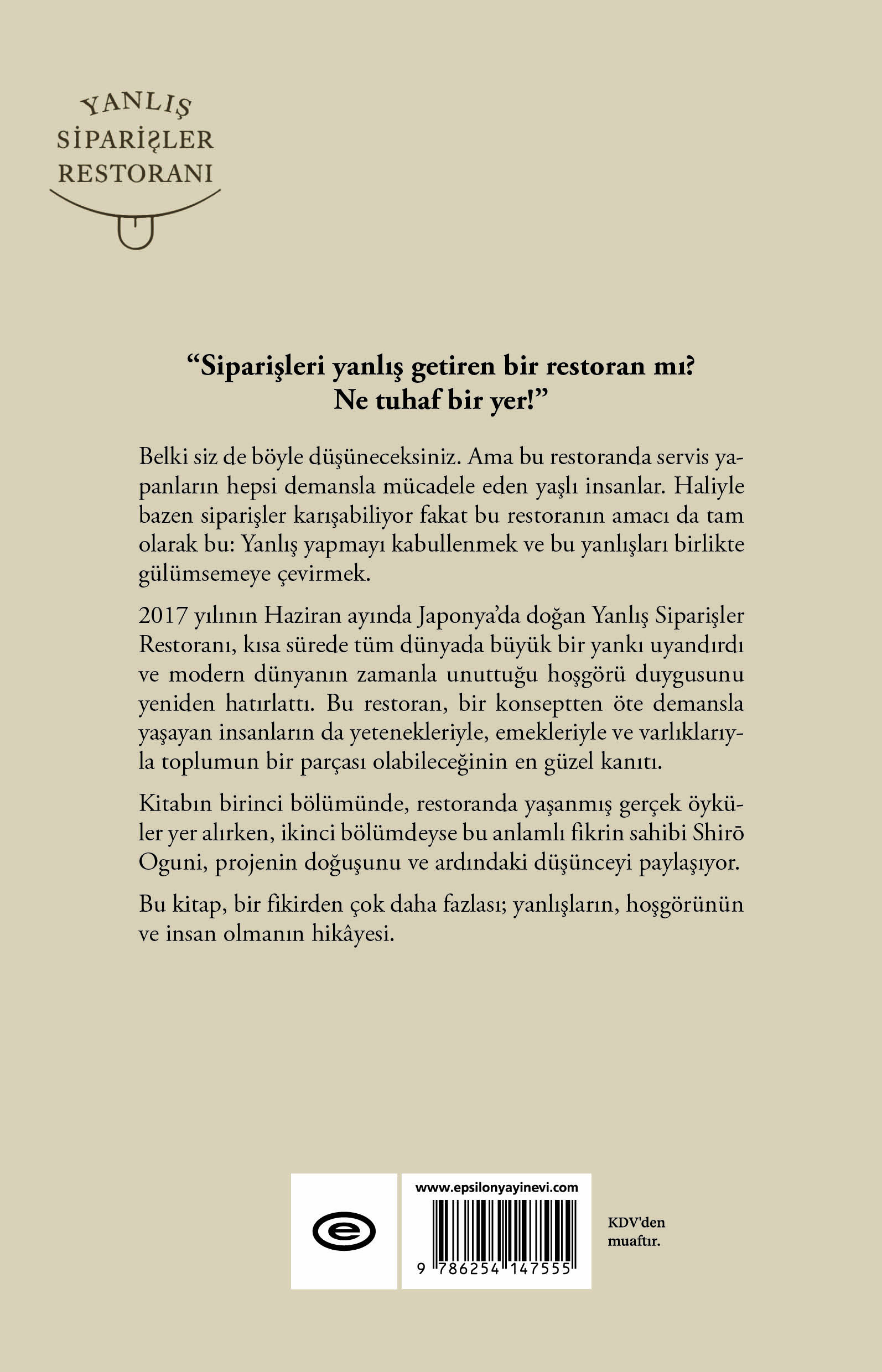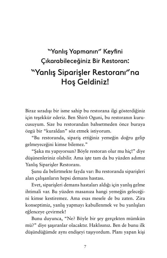 Kitabın birinci bölümünde, restoranda yaşanmış gerçek öyküler yer alırken, ikinci bölümdeyse bu anlamlı fikrin sahibi Shirō Oguni, projenin doğuşunu ve ardındaki düşünceyi paylaşıyor.