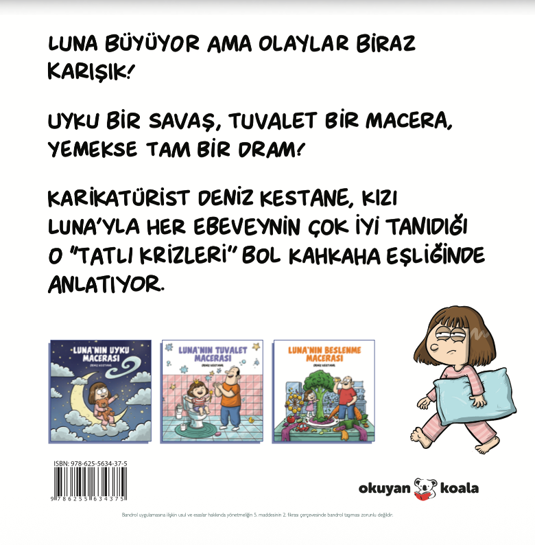 Luna’nın Maceraları, karikatürist Deniz Kestane’nin kendi kızıyla yaşadığı küçük ama büyülü anlardan doğan; beslenme, uyku ve tuvalet eğitimi gibi çocuk gelişiminin temel yapı taşlarını sevgi, oyun ve yaratıcılıkla anlatan bir erken çocukluk serisi. Her kitabında ebeveynlikteki gerçek duyguları saklamadan, yargılamadan ve “mükemmel ebeveyn” kalıplarına girmeden anlatan bu seri; çocuklara güven, ebeveynlere ise nefes aldıran bir rehberlik sunuyor.