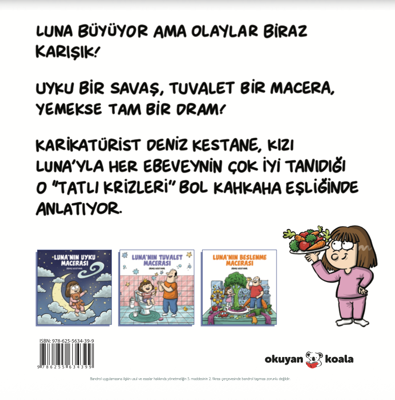 Luna’nın Maceraları, karikatürist Deniz Kestane’nin kendi kızıyla yaşadığı küçük ama büyülü anlardan doğan; beslenme, uyku ve tuvalet eğitimi gibi çocuk gelişiminin temel yapı taşlarını sevgi, oyun ve yaratıcılıkla anlatan bir erken çocukluk serisi. Her kitabında ebeveynlikteki gerçek duyguları saklamadan, yargılamadan ve “mükemmel ebeveyn” kalıplarına girmeden anlatan bu seri; çocuklara güven, ebeveynlere ise nefes aldıran bir rehberlik sunuyor.