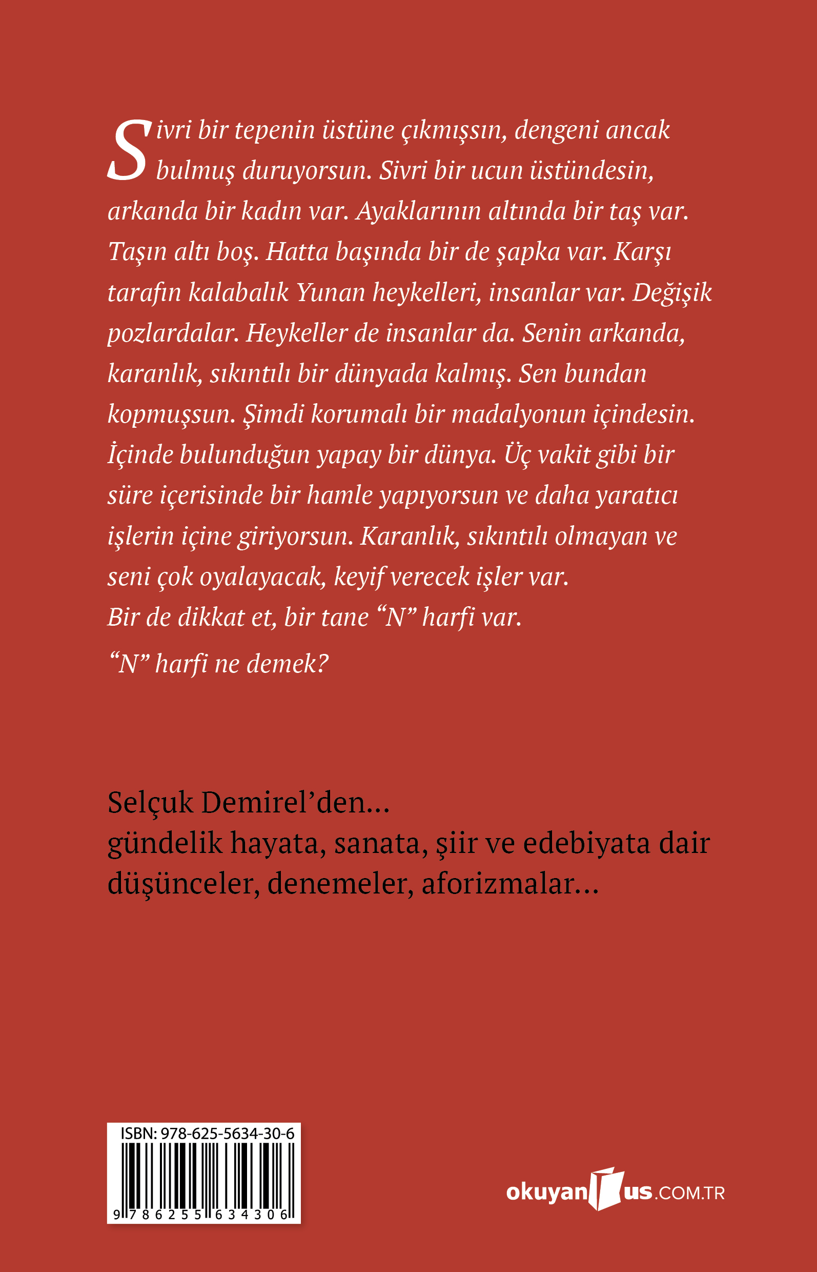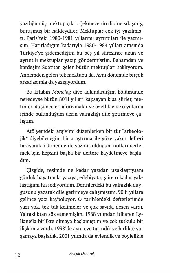 Paris’e taşındığı ilk yıllarında yaşadığı zorluklara, memleket özlemine, yeni ve eski dostluklarına yer verdiği yazılarında ve mektuplarında samimi paylaşımlarıyla okuyuculara Selçuk Demirel’in bilinmeyen iç dünyasının kapılarını açıyor. Kişisel anlatılarının yanı sıra 1980’li ve 1990’lı yıllarda not defterlerine yazdığı şiirler, denemeler, çeşitli kitaplardan aforizmalar, okuma önerileri kitabı edebiyat severler için bir ilham kaynağına dönüştürüyor.