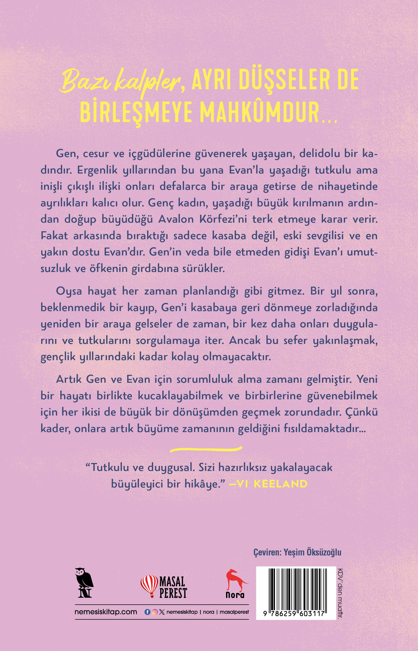 Gen, cesur ve içgüdülerine güvenerek yaşayan, delidolu bir kadındır. Ergenlik yıllarından bu yana Evan’la yaşadığı tutkulu ama inişli çıkışlı ilişki onları defalarca bir araya getirse de nihayetinde ayrılıkları kalıcı olur. Genç kadın, yaşadığı büyük kırılmanın ardından doğup büyüdüğü Avalon Körfezi’ni terk etmeye karar verir. Fakat arkasında bıraktığı sadece kasaba değil, eski sevgilisi ve en yakın dostu Evan’dır. Gen’in veda bile etmeden gidişi Evan’ı umutsuzluk ve öfkenin girdabına sürükler.