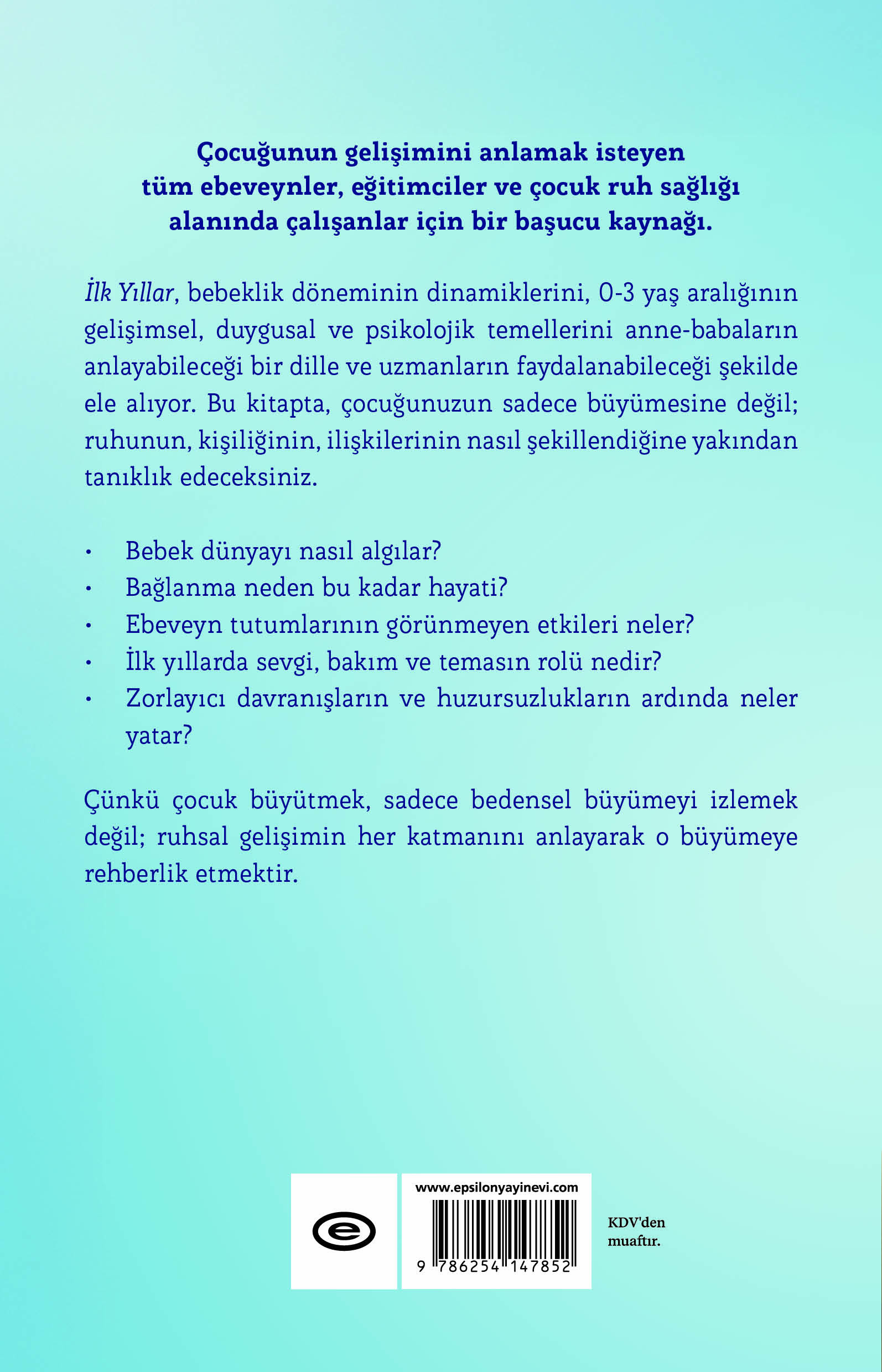İlk Yıllar, bebeklik döneminin dinamiklerini, 0-3 yaş aralığının gelişimsel, duygusal ve psikolojik temellerini anne-babaların anlayabileceği bir dille ve uzmanların faydalanabileceği şekilde ele alıyor. Bu kitapta, çocuğunuzun sadece büyümesine değil; ruhunun, kişiliğinin, ilişkilerinin nasıl şekillendiğine yakından tanıklık edeceksiniz.