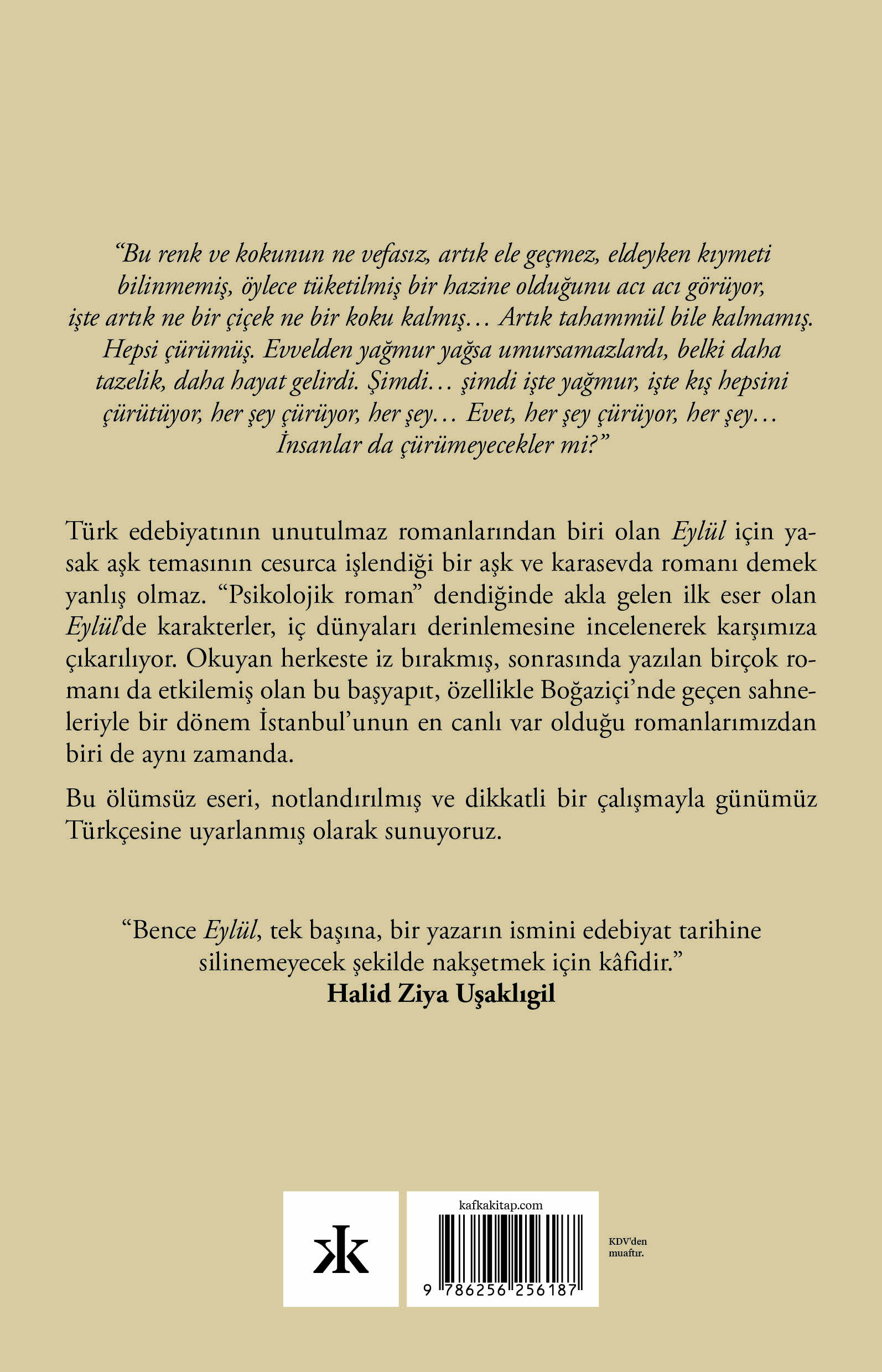 Türk edebiyatının unutulmaz romanlarından biri olan Eylül için yasak aşk temasının cesurca işlendiği bir aşk ve karasevda romanı demek yanlış olmaz. “Psikolojik roman” dendiğinde akla gelen ilk eser olan Eylül’de karakterler, iç dünyaları derinlemesine incelenerek karşımıza çıkarılıyor. Okuyan herkeste iz bırakmış, sonrasında yazılan birçok romanı da etkilemiş olan bu başyapıt, özellikle Boğaziçi’nde geçen sahneleriyle bir dönem İstanbul’unun en canlı var olduğu romanlarımızdan biri de aynı zamanda.