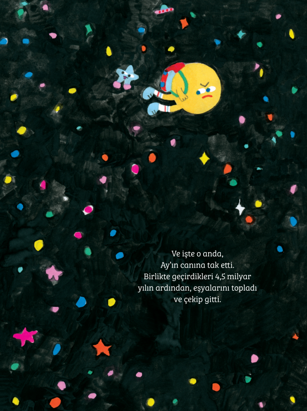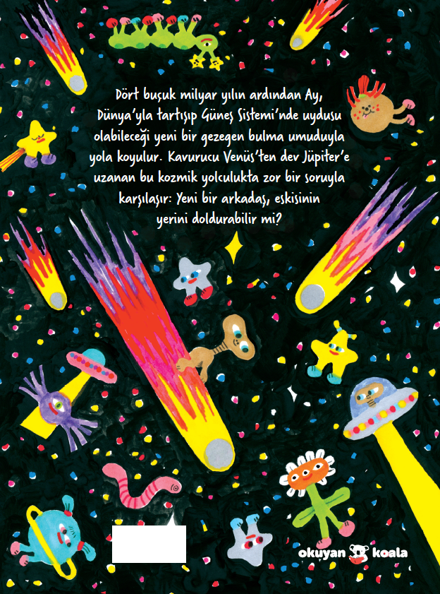 Her arkadaş zaman zaman tartışır. Fakat dört buçuk milyar yılın sonunda tahammül azalabilir ve tartışmalar ayrılıkla sonuçlanabilir. Ay bir gün Dünya’yla tartıştıktan sonra sabrının tükendiğini hisseder. Bunun üzerine, Güneş Sistemi’ni keşfetmek için ve uydusu olabileceği yeni bir gezegen bulma umuduyla uzay yolculuğuna çıkar. Yolculuk boyunca Ay, kavurucu Venüs’ten dev Jüpiter’e kadar gezegenlerin hem tuhaflıkları hem de büyüleyici özellikleriyle tanışır. Satürn’le geçirilen bir gece eğlencesi onu bitkin düşürür. Uranüs fazla kokuludur, Neptün ıssız ve soğuktur; üstelik Plüton hala gezegen sayılıyor mudur? Ay, Güneş Sistemi’nin soğuk ve yalnız sınırlarına vardığında birdenbire Dünya’yı özlemeye ve belki de Dünya’nın o kadar da kötü olmadığını düşünmeye başlar.