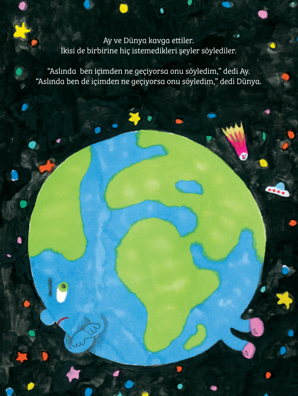 Coşkulu illüstrasyonları, ince mizahı ve duyguları sıradışı ele alan sahneleriyle bu hikaye; dostluğun değerini, bağlantıda kalmanın önemini ve bazen aradığımız şeyin aslında çok daha yakınımızda olabileceğini hatırlatır. Okura, anlaşmazlıkların ilişkilerin doğal bir parçası olduğunu hissettirirken; sorunların kaçarak ya da terk ederek değil, içinde durarak dönüşebileceğini hatırlatır. Elbette, konuşmadan önce biraz mola vermenin ve başka olasılıkları hayal etmenin iç dünyayı nasıl zenginleştirebileceğini çocuklara oyun tadında aktarır.