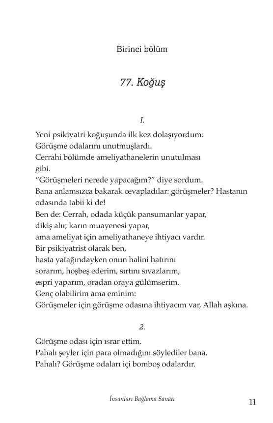 İnsanları Bağlama Sanatı, tıbbi bir raporun soğukluğundan uzak; şiire yaklaşan bir dille yazılmış. Yer yer sert, yer yer şefkatli ama her zaman dürüst. Yazar, psikiyatrinin gücünü yüceltmiyor; tam tersine, sınırlarını gösteriyor. İyileştirmenin mümkün olmadığı anlarda bile insan kalabilmenin ne demek olduğunu soruyor.