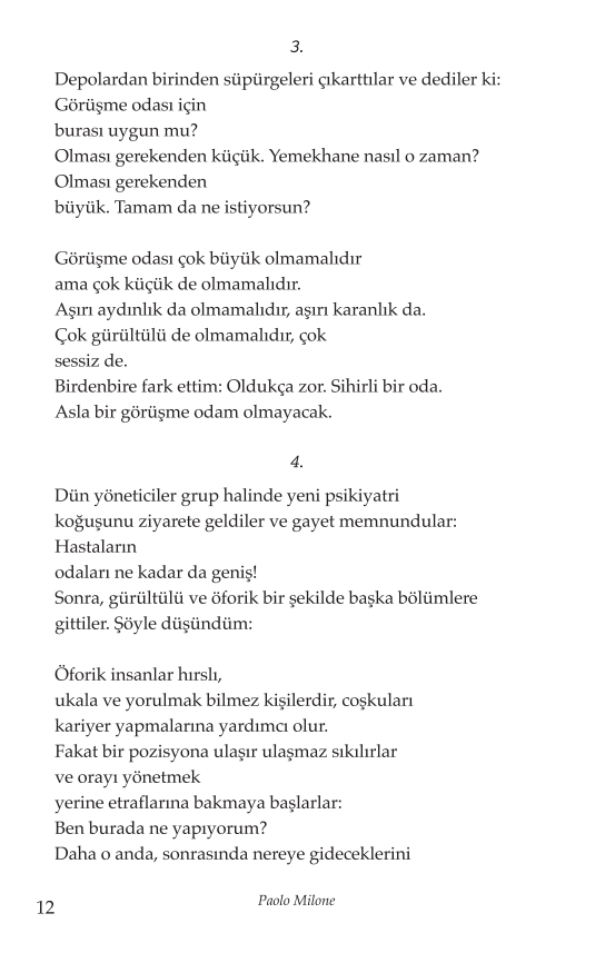 Kısa ama yoğun bölümlerden oluşan bu kitapta, bir psikiyatri servisinin gündelik hayatı; hastalar, hemşireler, doktorlar ve anlatıcının kendisi aracılığıyla görünür hale geliyor. Her hikaye, delilikle normallik arasındaki sınırların ne kadar geçirgen olduğunu hatırlatıyor. Milone’un anlatısında kimse “uzaktan” izlenmiyor: Okur o servisin içine, o kararların tam ortasına çekiliyor.