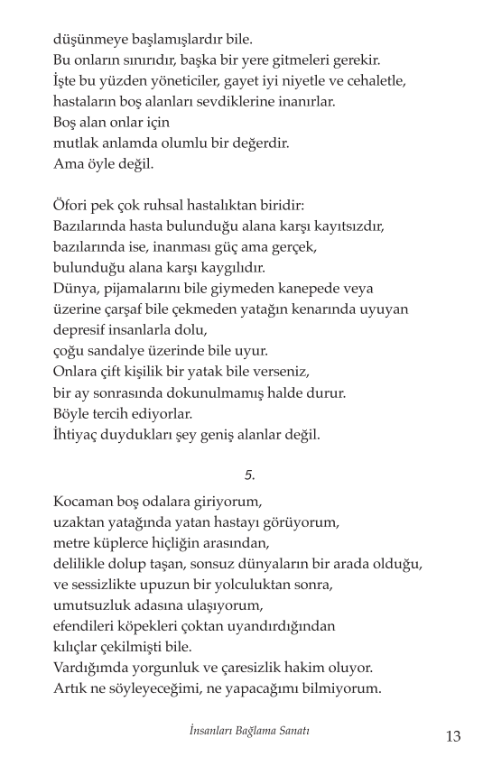 Bu kitap, “akıl hastalığı”nı açıklamaya çalışan bir metin değil. Aksine, akıl hastanesini —tüm çelişkileri, etik ikilemleri ve insani ağırlığıyla— olduğu gibi gösteren edebi bir anlatı. Milone, psikiyatride uygulanan “bağlama” pratiğini yalnızca fiziksel bir müdahale olarak değil; güç, korku, sorumluluk ve vicdanla örülü karmaşık bir ilişki biçimi olarak ele alıyor. Kimi zaman bir hastayı yatağa bağlamak gerekir; kimi zaman da insanı hayata bağlayan tek şey, onunla aynı odada kalabilmektir.