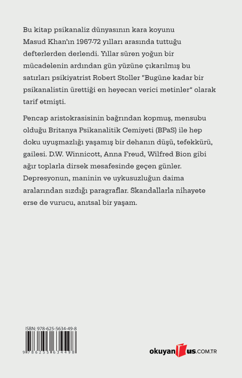 Masud Khan, bir dönem D. W. Winnicott’un en yakın çevresinde yer almış, psikanalitik düşünceye önemli katkılar sunmuş bir isimdi ancak aynı zamanda etik ihlaller, kişisel istikrarsızlıklar ve mesleki düşüşle anıldı. Bu kitap, Khan’ı aklamaya ya da mahkum etmeye çalışmıyor. Onun yerine, çok daha zor bir şey yapıyor: Onu olduğu gibi gösteriyor. Ve bu dürüstlük okuru yalnızca Khan’la değil, psikanalizin kendisiyle de yüzleşmeye zorluyor.