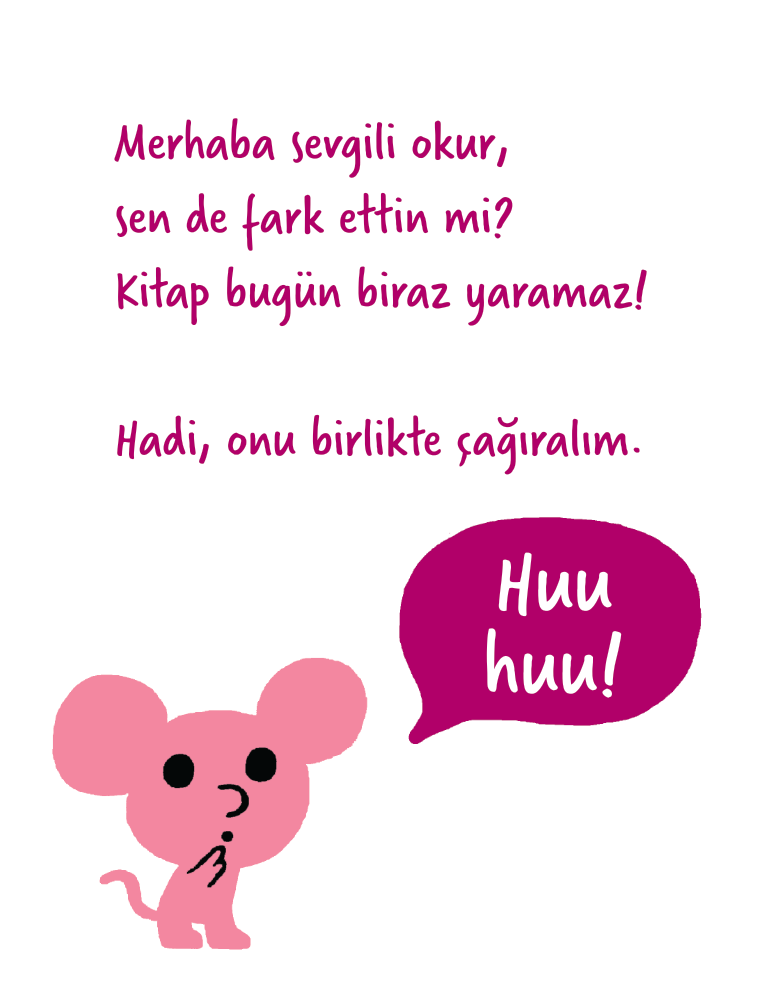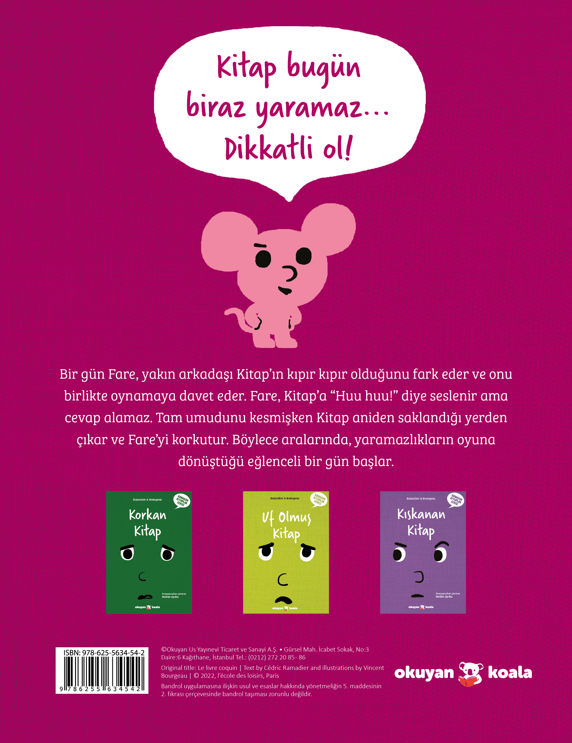 Bir gün Fare, yakın arkadaşı Kitap’ın kıpır kıpır olduğunu fark eder ve onu birlikte oynamaya davet eder. Fare, Kitap’a “Huu huu!” diye seslenir ama cevap alamaz. Tam umudunu kesmişken Kitap aniden saklandığı yerden çıkar ve Fare’yi korkutur. Böylece aralarında, yaramazlıkların oyuna dönüştüğü eğlenceli bir gün başlar.