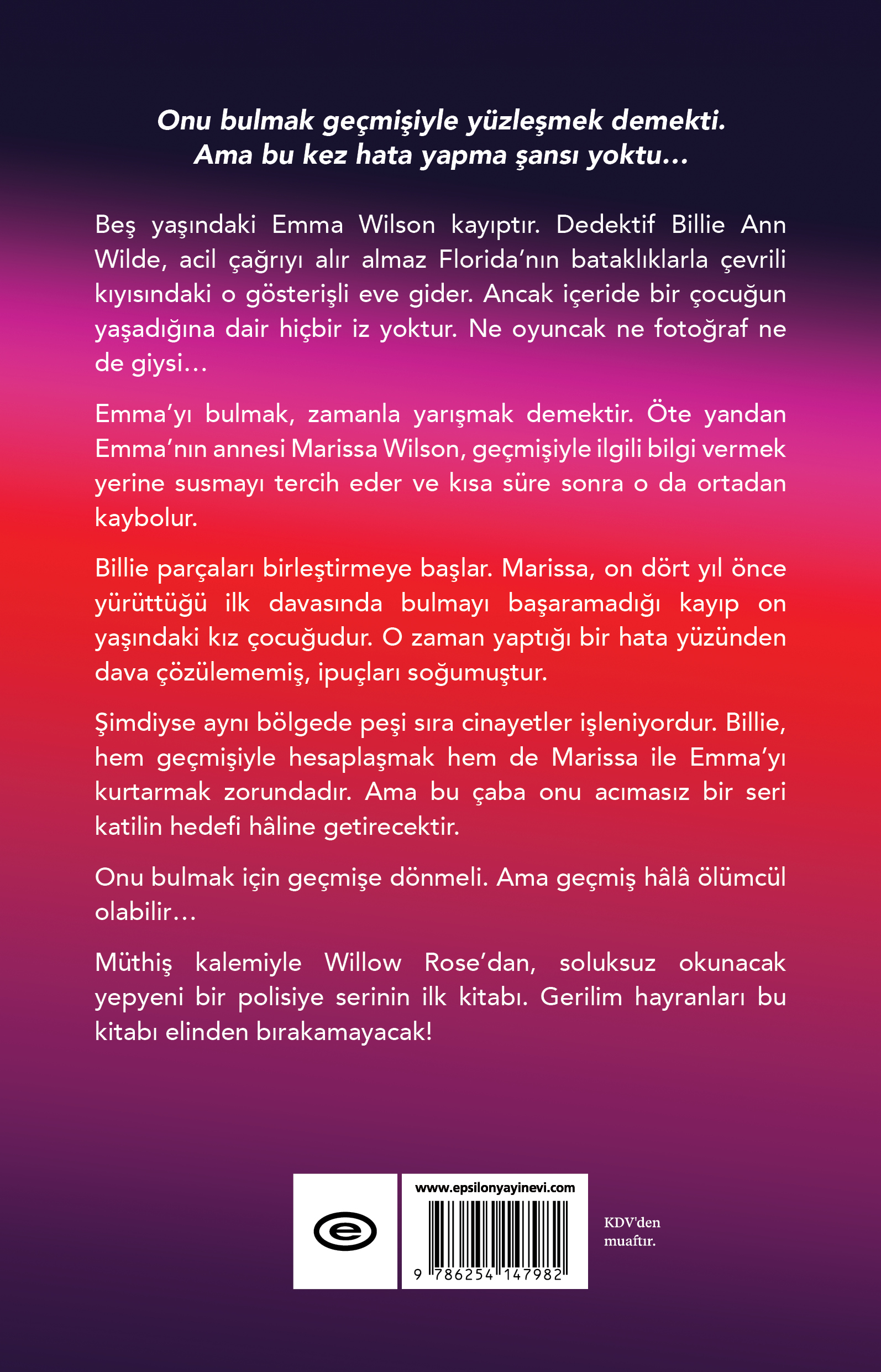 Beş yaşındaki Emma Wilson kayıptır. Dedektif Billie Ann Wilde, acil çağrıyı alır almaz Florida’nın bataklıklarla çevrili kıyısındaki o gösterişli eve gider. Ancak içeride bir çocuğun yaşadığına dair hiçbir iz yoktur. Ne oyuncak ne fotoğraf ne de giysi…