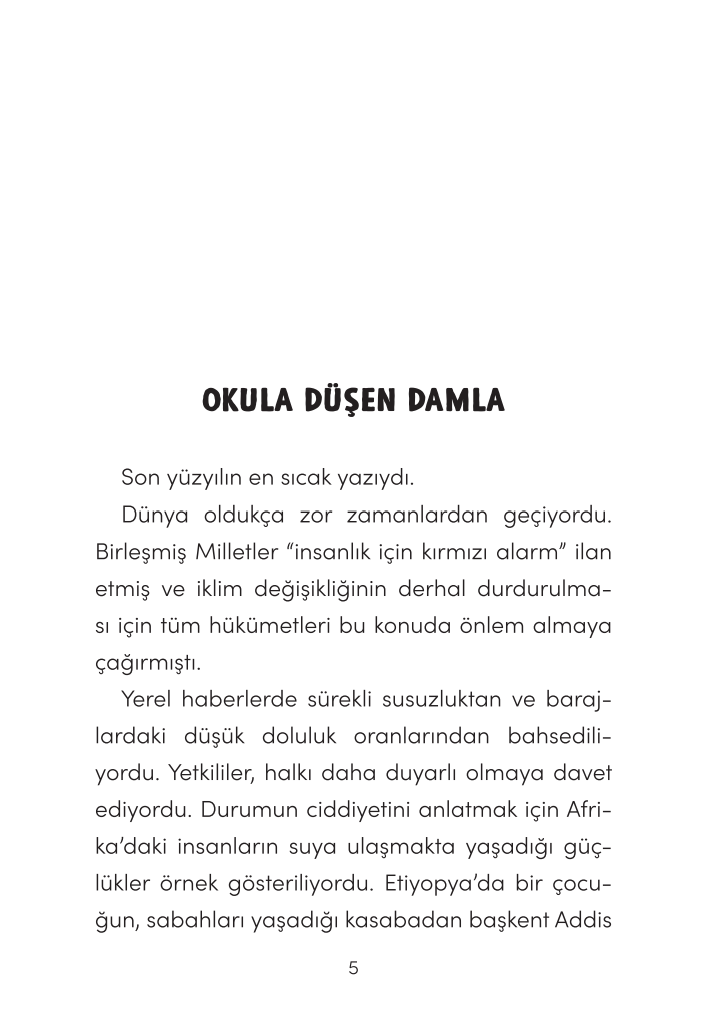İklim krizi tehlikesini gören Derin ve yeni arkadaşı önderliğinde kısa sürede tüm okul harekete geçerek suyu korumak için yaratıcı projeler üretir ve unutulmayacak bir geziye katılmaya hak kazanır.
