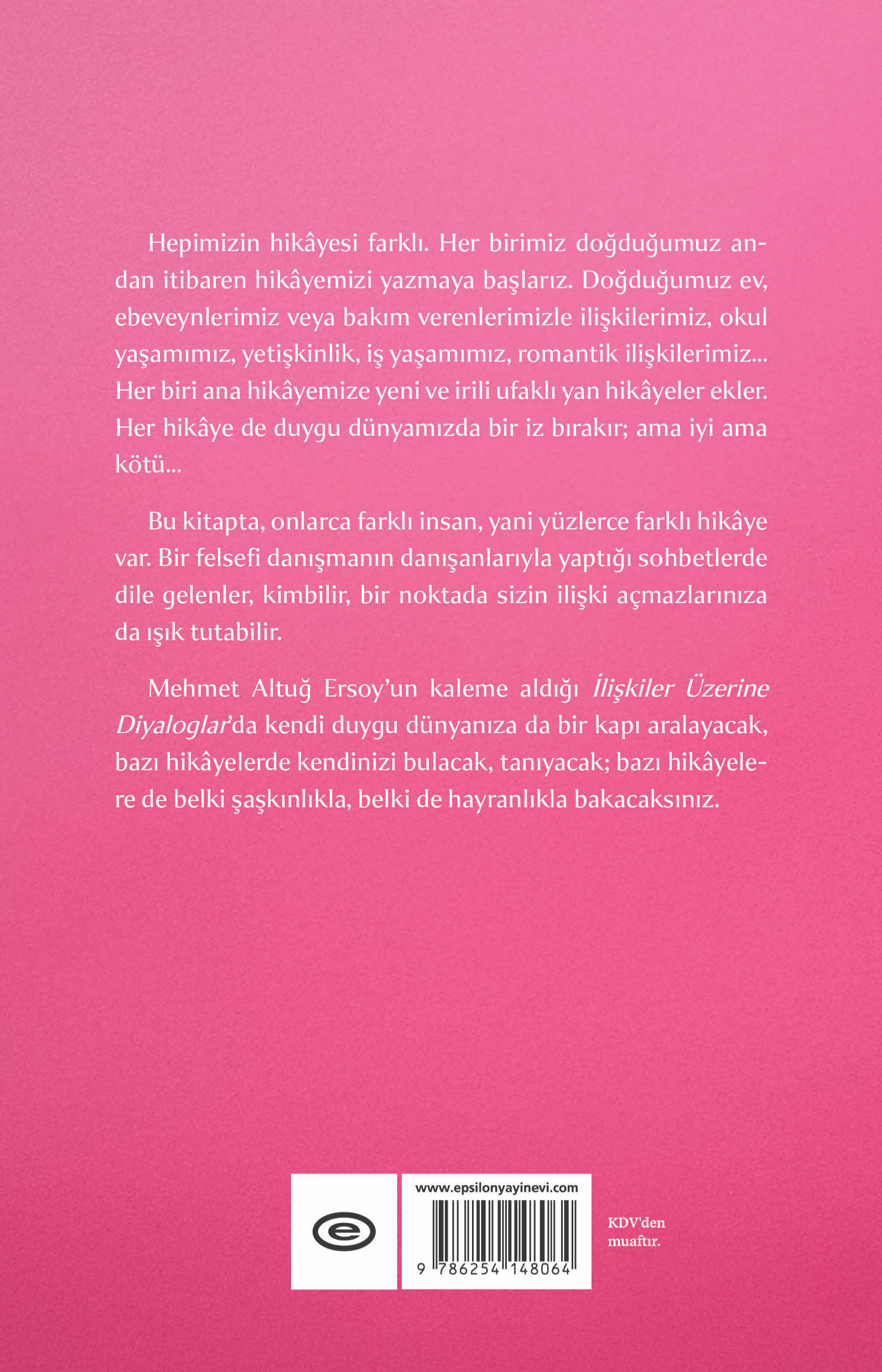 Mehmet Altuğ Ersoy’un kaleme aldığı İlişkiler Üzerine Diyaloglar’da kendi duygu dünyanıza da bir kapı aralayacak, bazı hikâyelerde kendinizi bulacak, tanıyacak; bazı hikâyelere de belki şaşkınlıkla, belki de hayranlıkla bakacaksınız.
