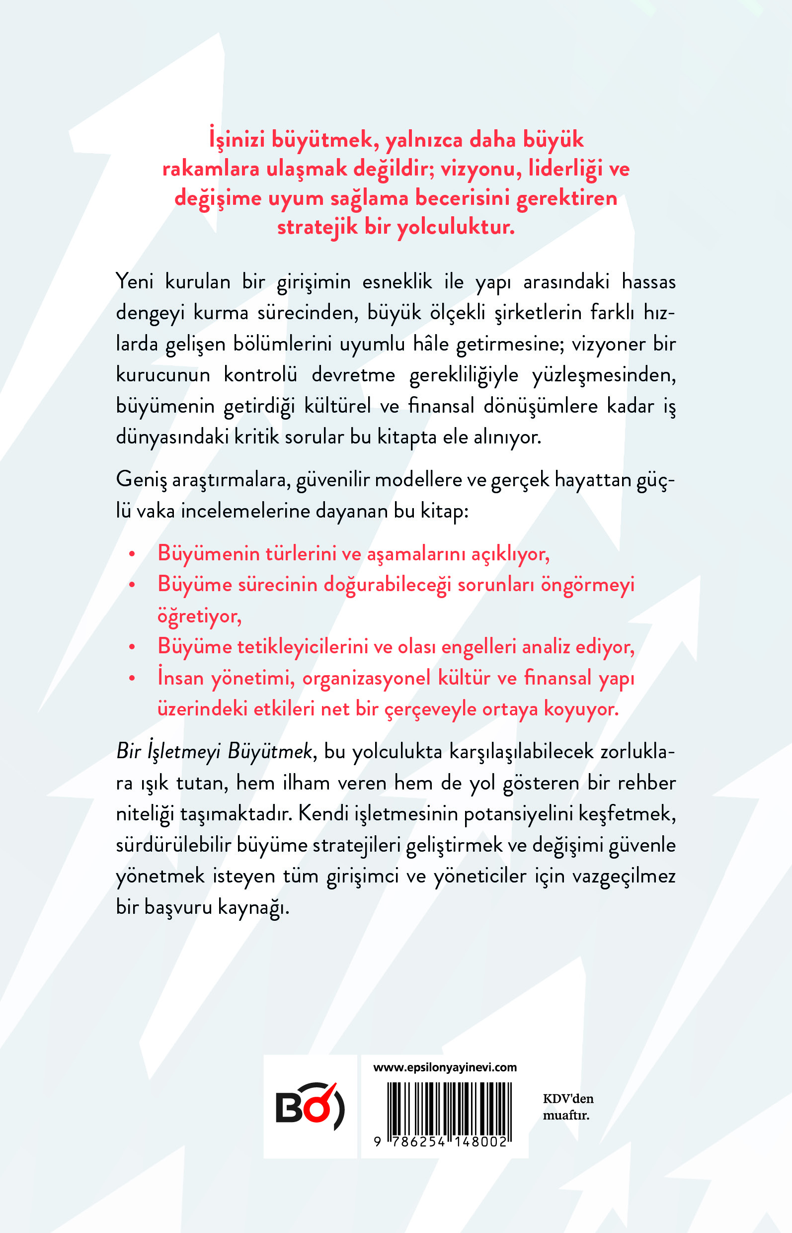 Bir İşletmeyi Büyütmek, bu yolculukta karşılaşılabilecek zorluklara ışık tutan, hem ilham veren hem de yol gösteren bir rehber niteliği taşımaktadır. Kendi işletmesinin potansiyelini keşfetmek, sürdürülebilir büyüme stratejileri geliştirmek ve değişimi güvenle yönetmek isteyen tüm girişimci ve yöneticiler için vazgeçilmez bir başvuru kaynağı.